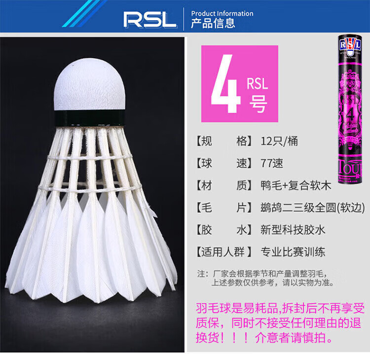 亚狮龙(RSL) NO.4号 77速 12只/桶 羽毛球 白色(单位:桶)