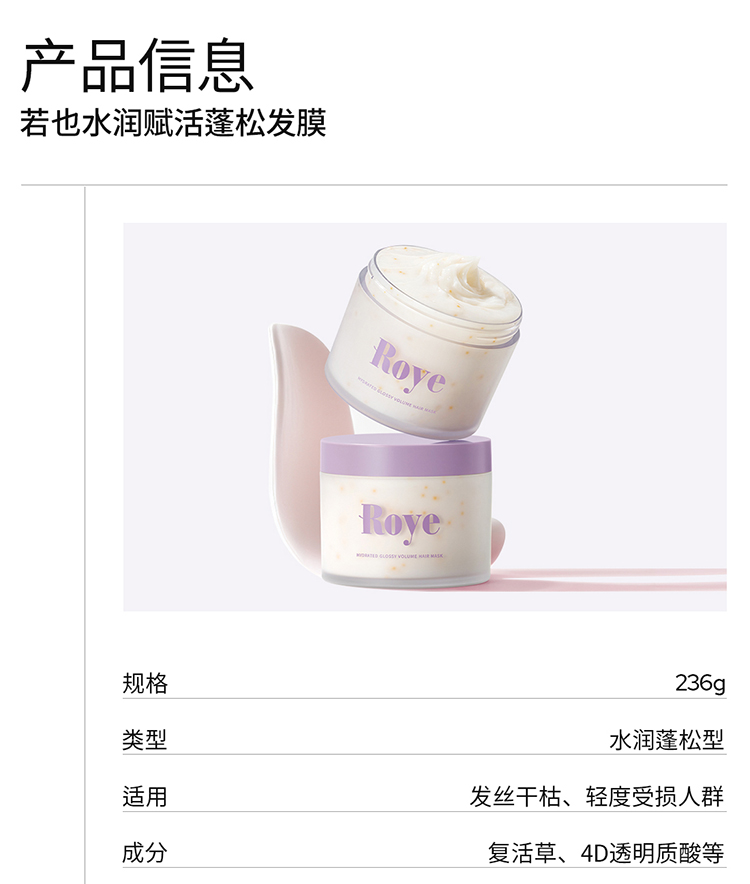 若也(Roye) 水润蓬松型 236g*1罐 水润赋活蓬松发膜 白色(单位:罐)