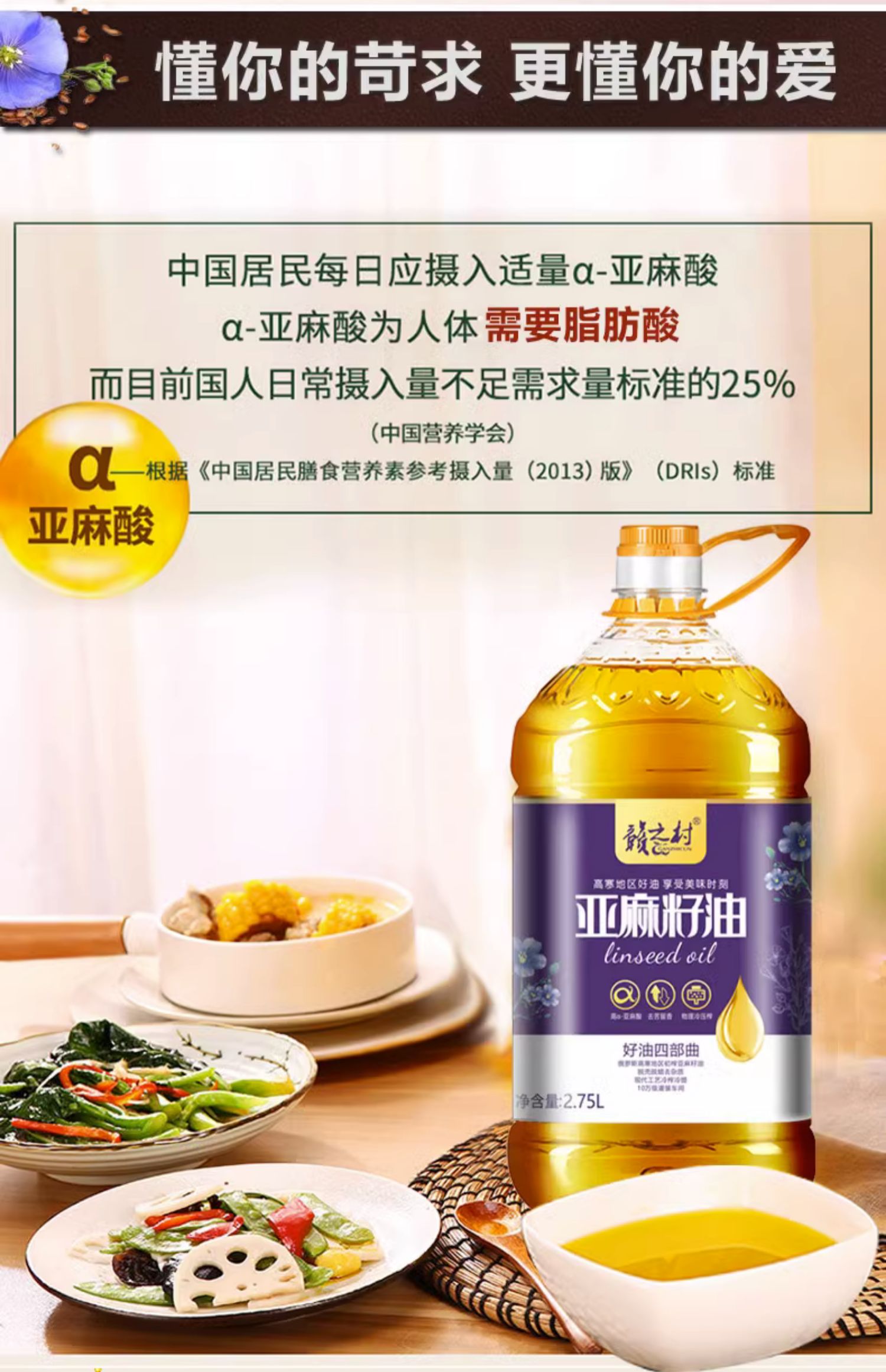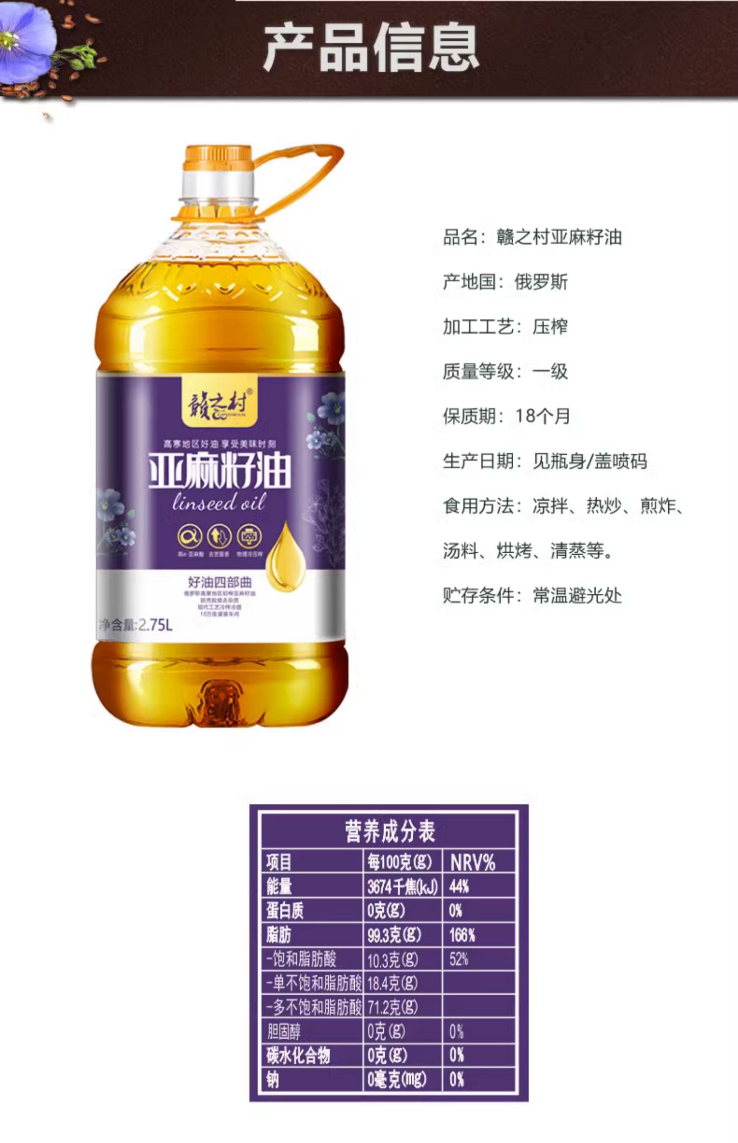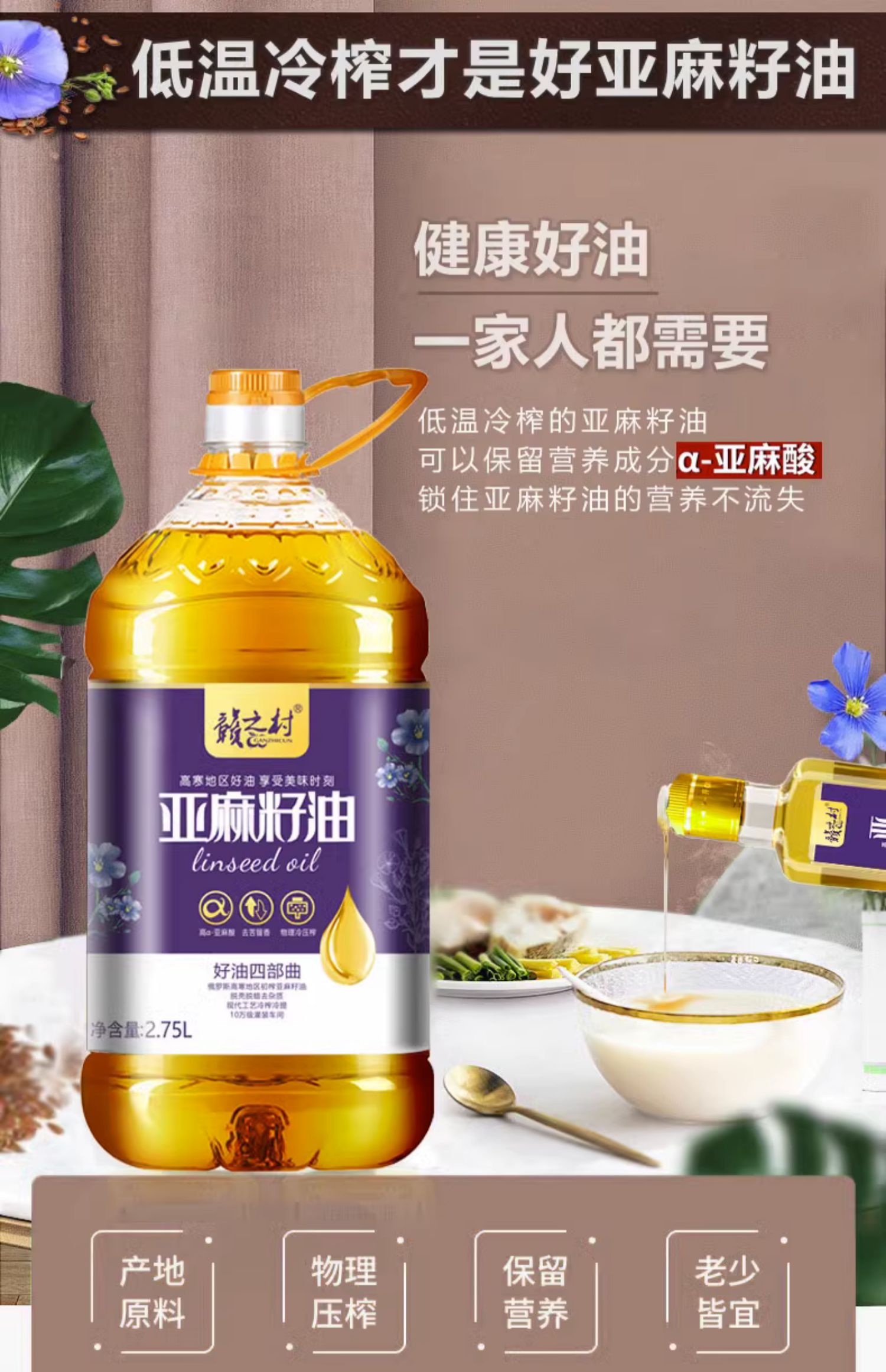 赣之村 亚麻籽油 2.75L 物理冷压榨一级 2.75L/瓶 混色(单位:瓶)