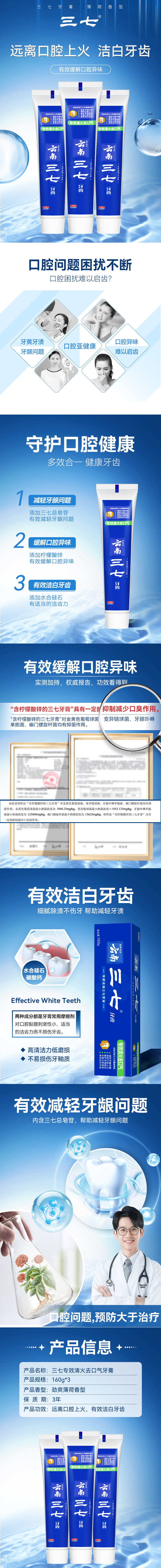 三七 牙膏 专效清火去口气 160g*3支 宝石蓝(单位:套)