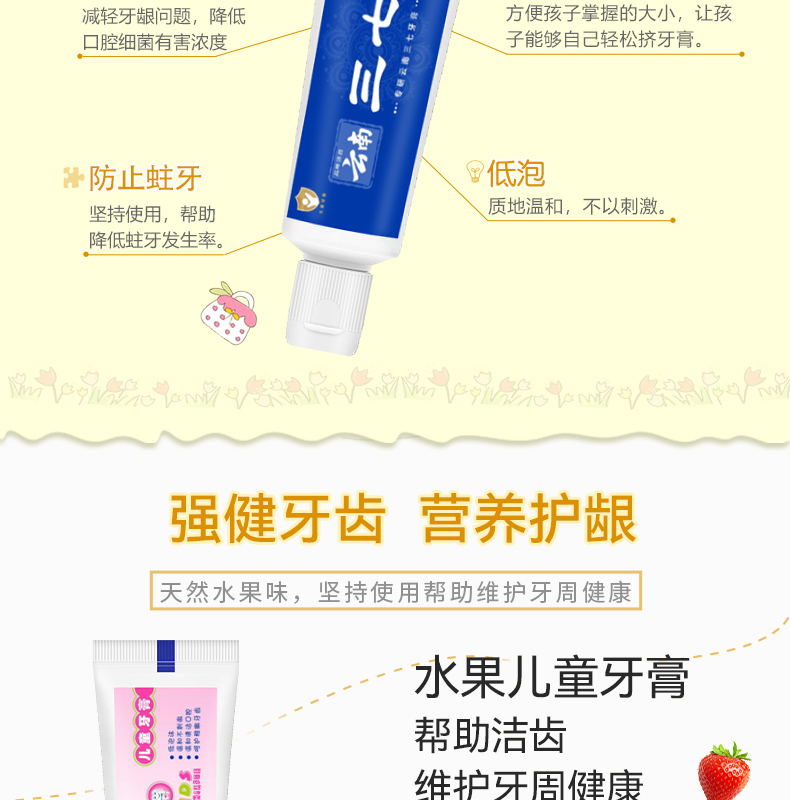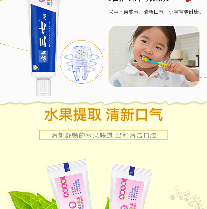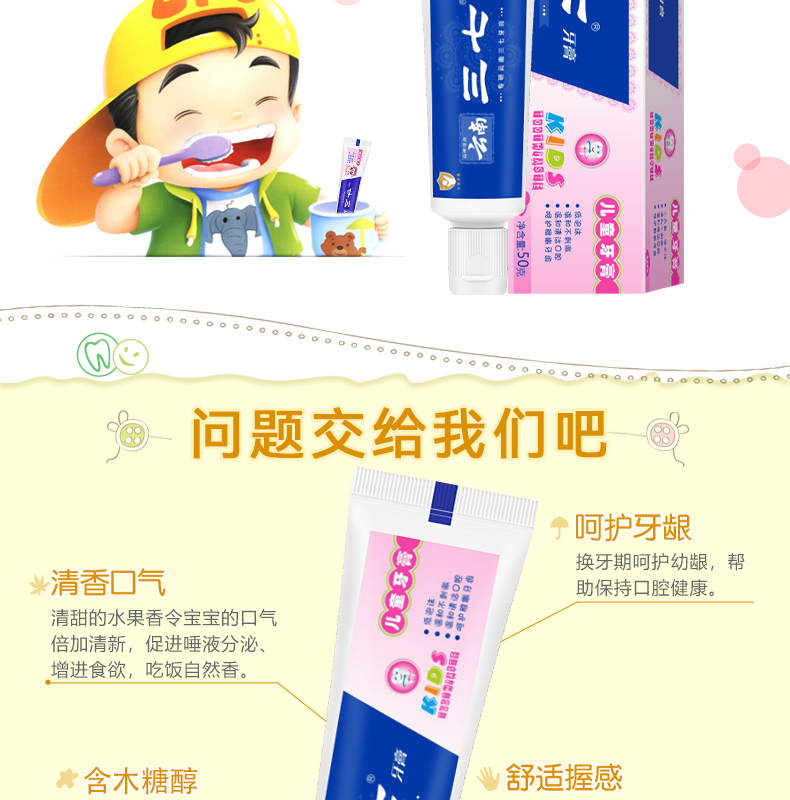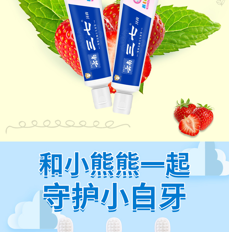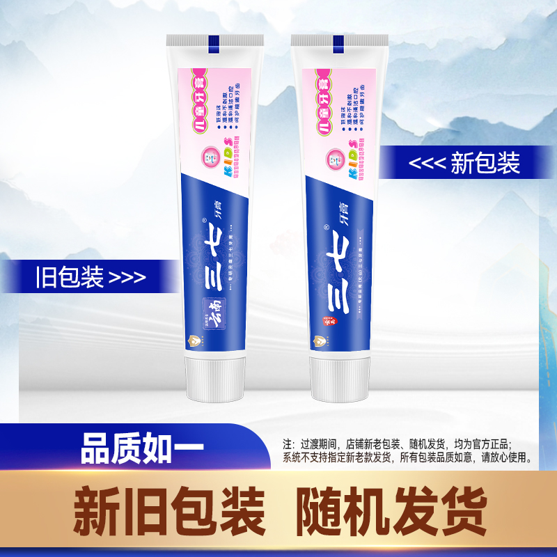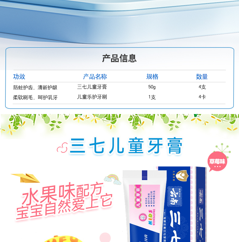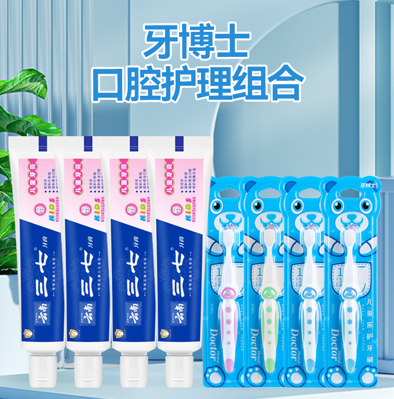 三七 牙膏 水果味儿童防止蛀牙 温和洁浄 呵护乳牙 50g*4支+牙刷*4支 混色(单位:套)
