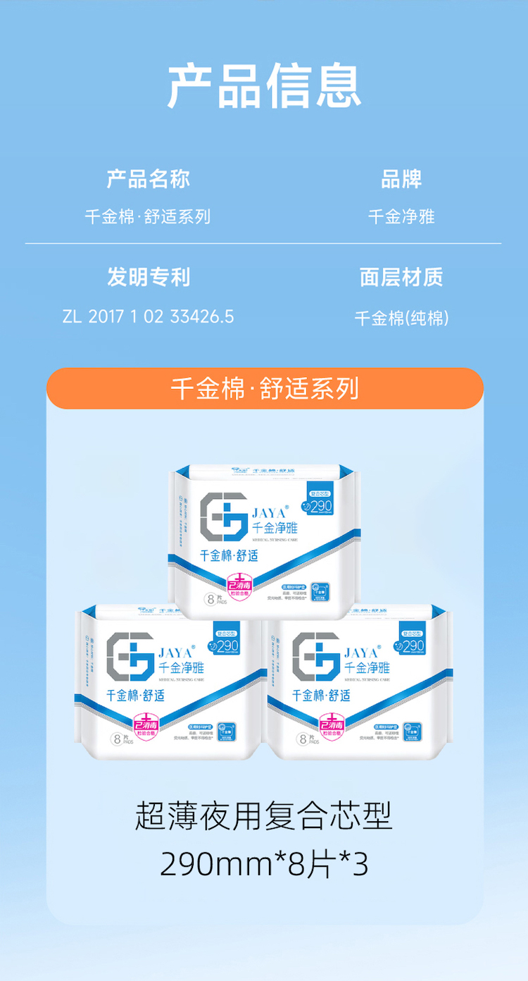 千金净雅 卫生巾 医护级中量型超薄夜用 290mm*8片*3袋 混色(单位:组)