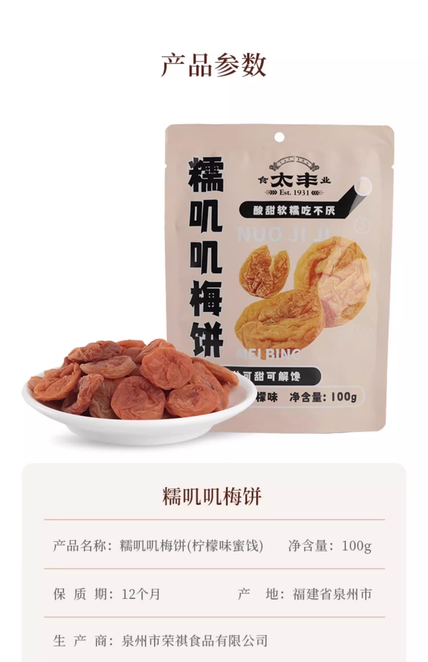 太丰 无核梅饼 柠檬味蜜饯 100g*2包 米色(单位:组)
