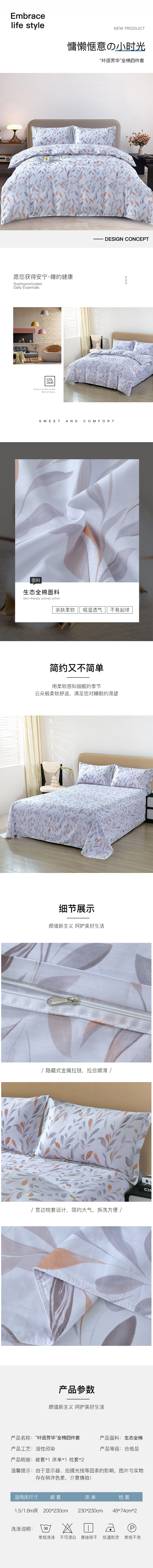 紫韵 “叶语芳华”全棉四件套 ZY-TJ1781 被套:200*230cm 钢琴白(单位:套)