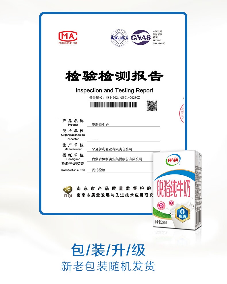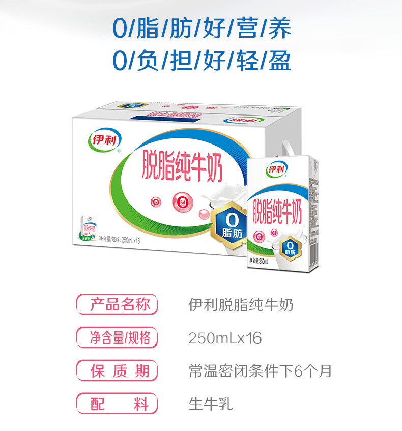 伊利 营养早餐奶 脱脂纯牛奶 250ml*16盒*1箱 混色(单位:箱)
