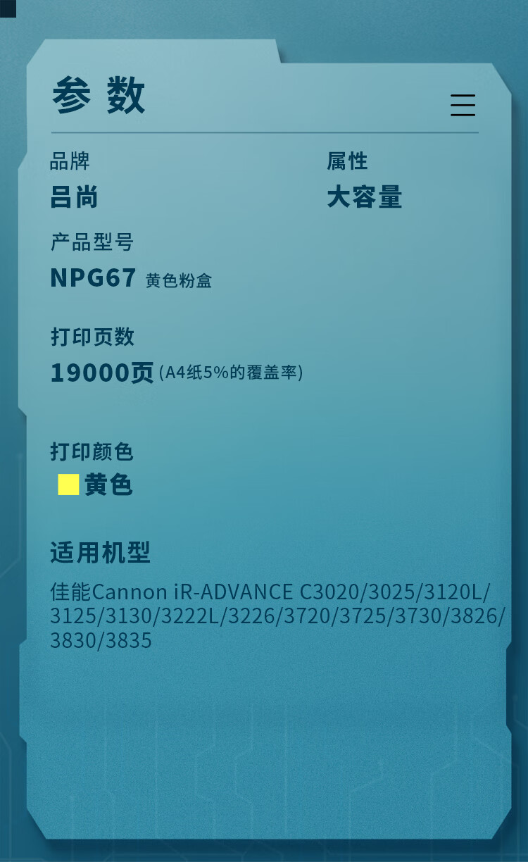 吕尚 NPG-67 19000页 大容量适用佳能3125/3120L/c3020/3226 粉盒 (计价单位:只) 黄色