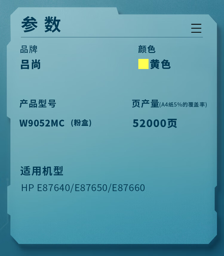 吕尚 W9052MC墨粉盒 52000页 适用HP E87640/E87650/E87660 硒鼓 1.00 只/个 (计价单位:个) 黄色 黄色