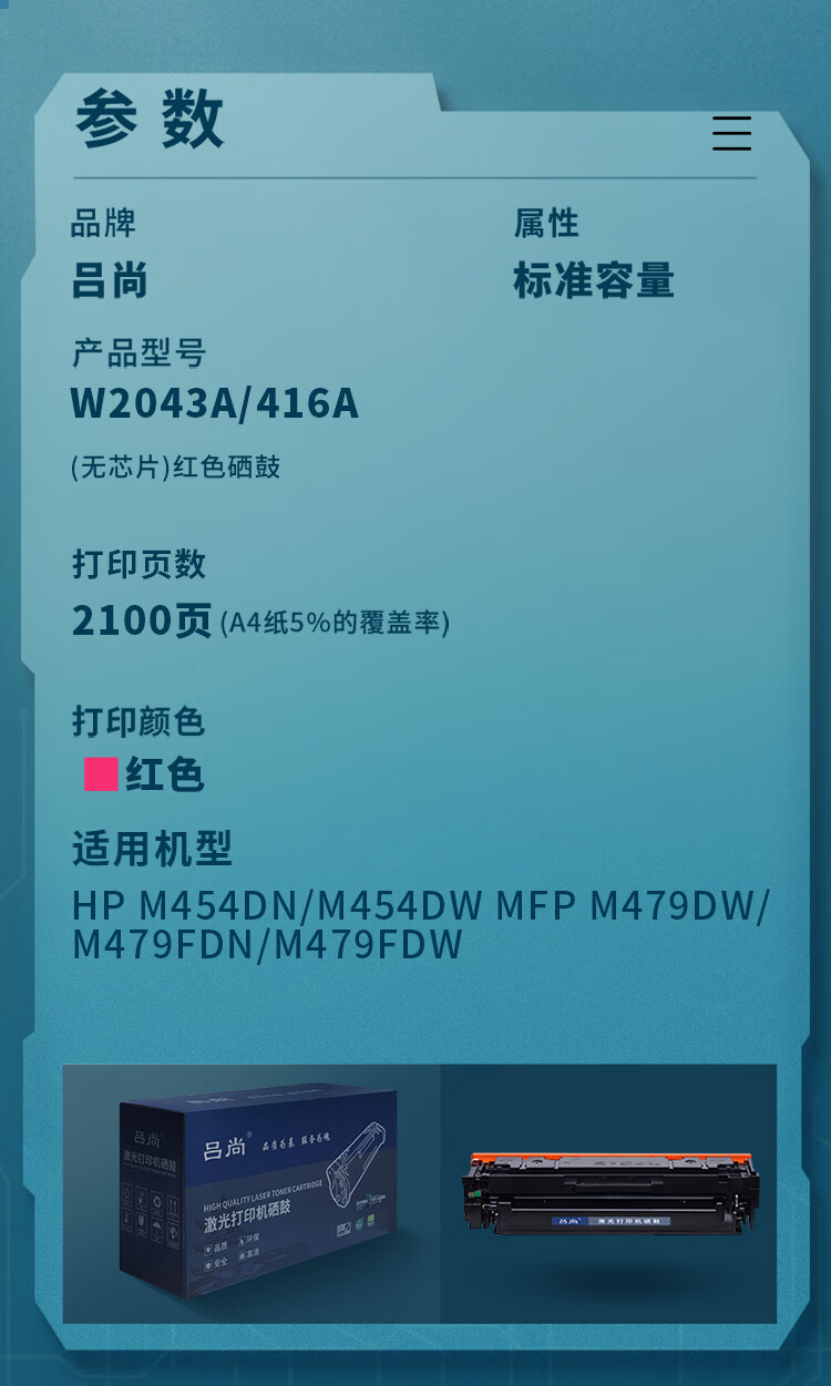 吕尚 416a A系列适用惠普HPM454dn M479dw M479fdn 打印机墨盒W2043A无芯片打印页数:2100页 硒鼓 (计价单位:只) 红色 红色