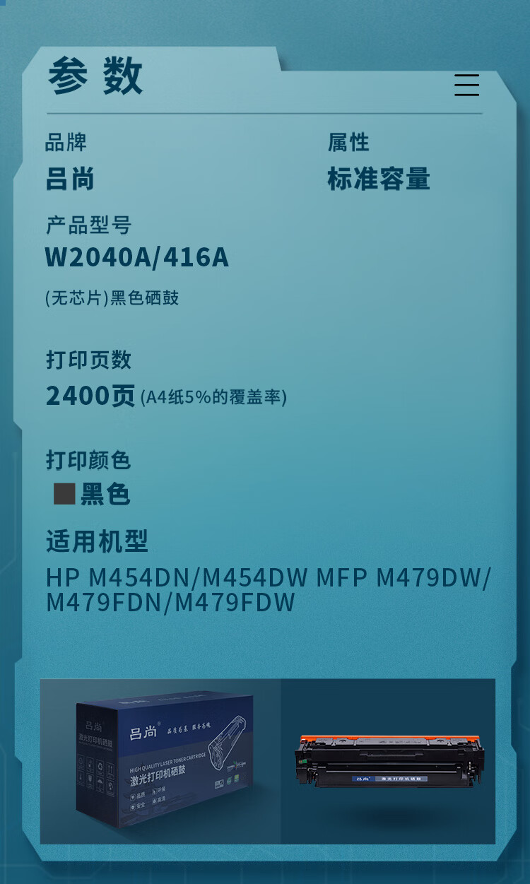吕尚 416a A系列适用惠普HPM454dn M479dw M479fdn打印机墨盒W2040A无芯片 打印页数:2400页 硒鼓 (计价单位:只) 黑色 黑色