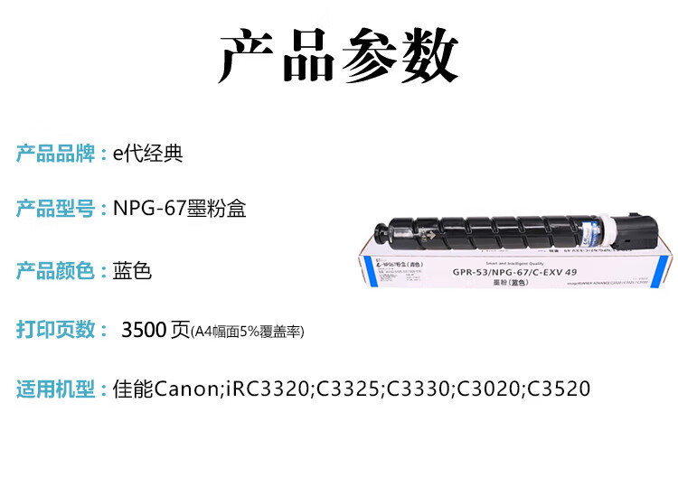 e代经典 NPG-67 19000页 蓝 适用佳能iRC3320 C3325 C3330 粉盒 1.00 只/支 (计价单位:支) 蓝色