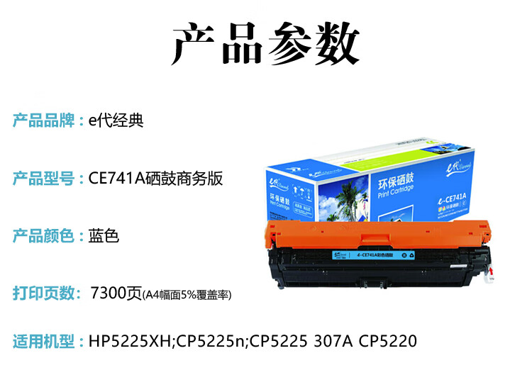 e代经典 CE741A 打印数量:7300页 商务版 适用HP 5225 CE740A等 硒鼓 1.00 只/支 (计价单位:支) 蓝色