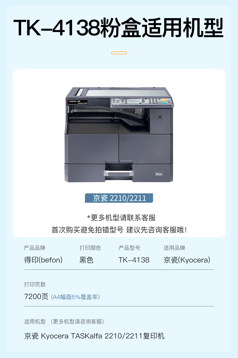 得印(befon) TK-4138 7200页 适用京瓷TASKalfa 2210/2211复印机 粉盒 1.00 只/支 (计价单位:支) 黑色