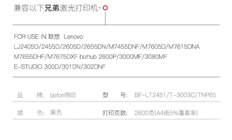 得印(befon) PLUS BF-LT2451 2600页适用联想LJ2605DLJ2655DN 墨粉盒 1.00 只/支 (计价单位:支) 黑色