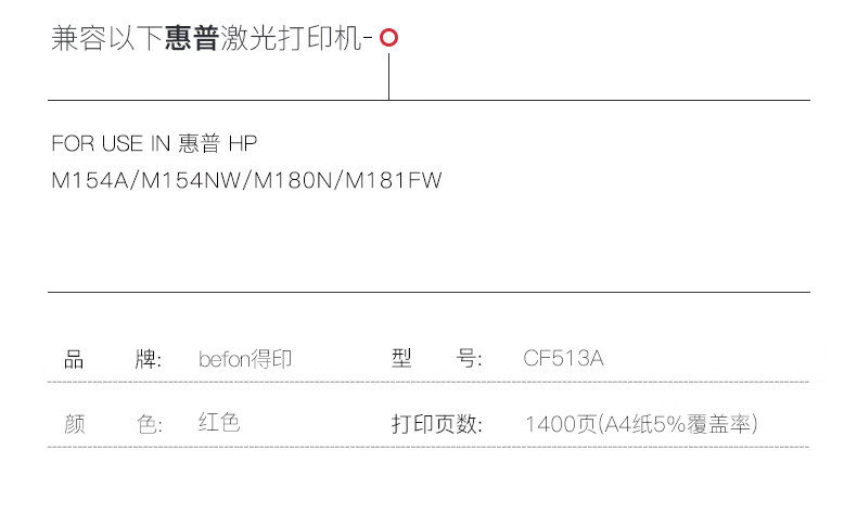 得印(befon) PLUS BF-CF513A 打印量约900页 适用HP M154 M180等 硒鼓 (计价单位:只) 红色