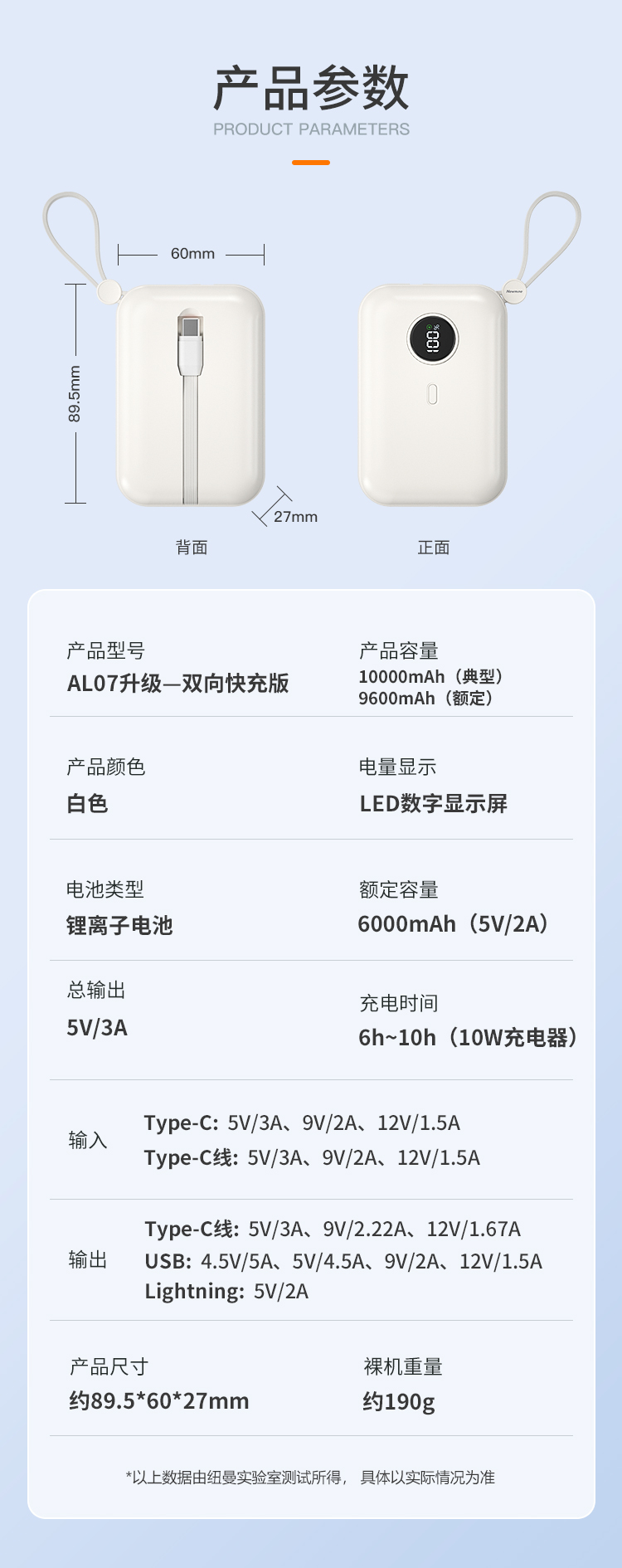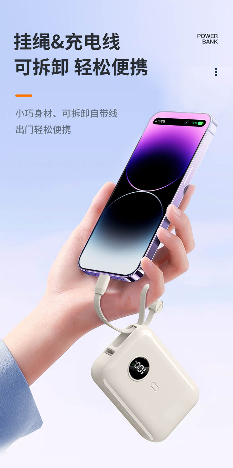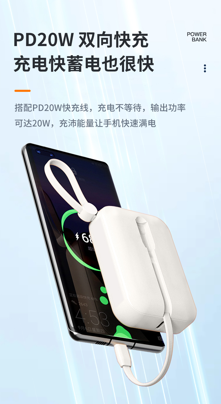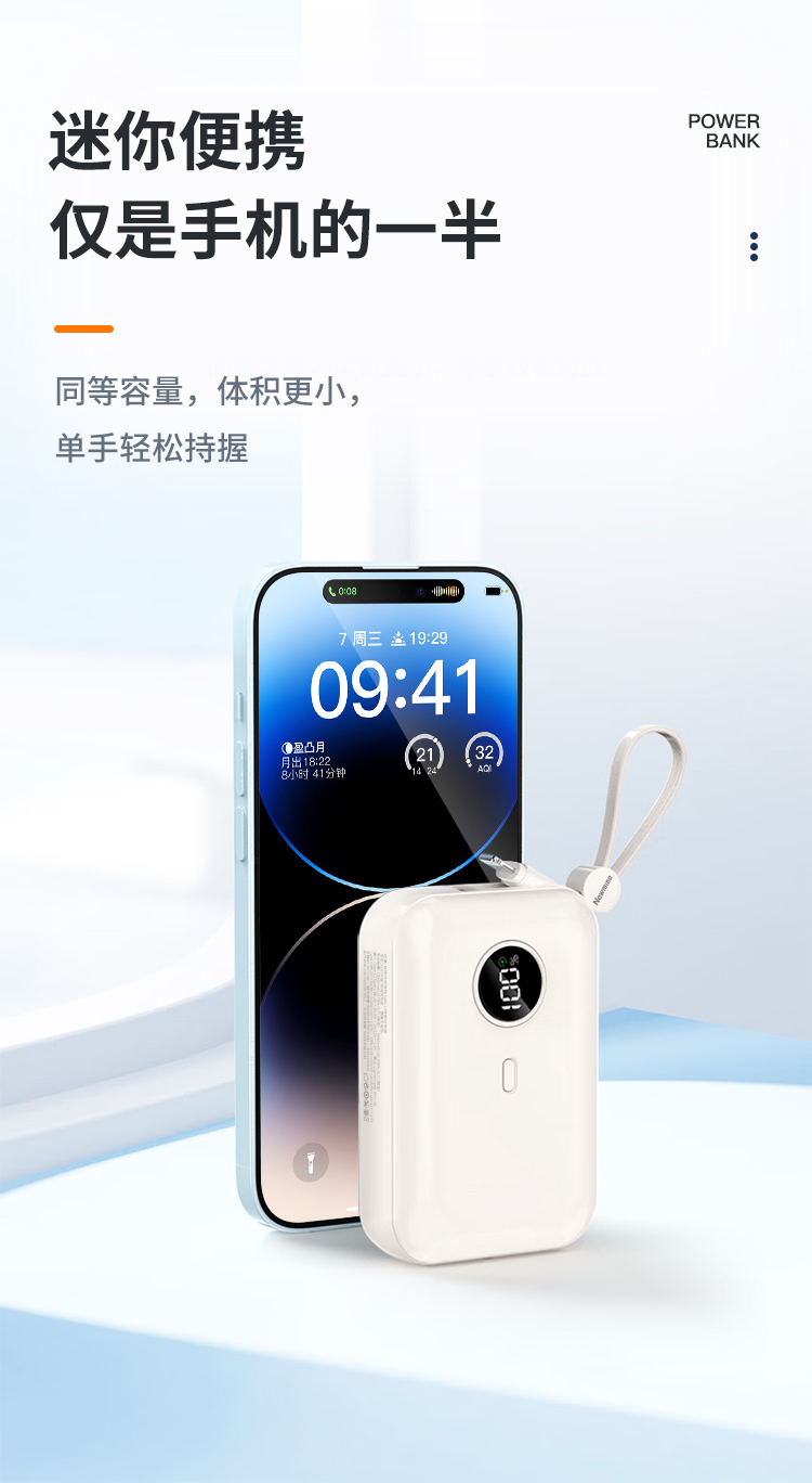 纽曼自带线22.5W超级快充移动电源20W双向快充10000毫安充电宝三输出二输入AL07双向快充个 奶茶色
