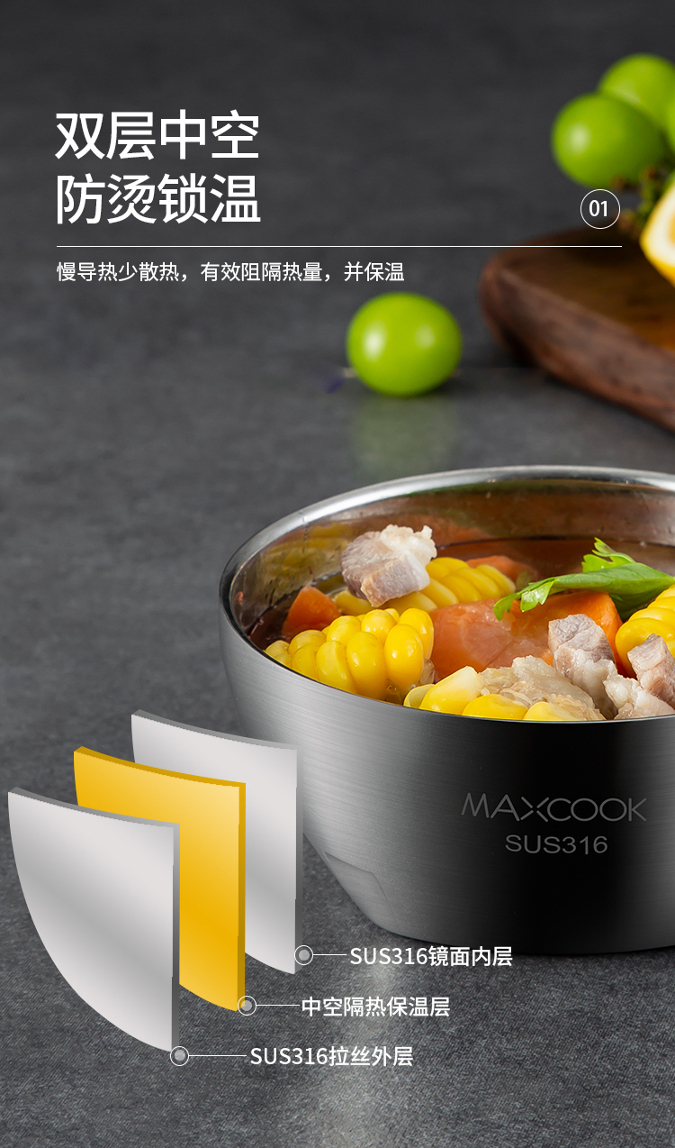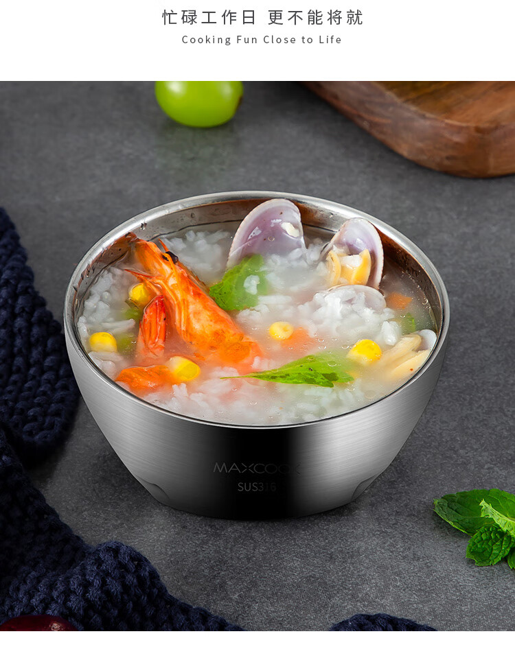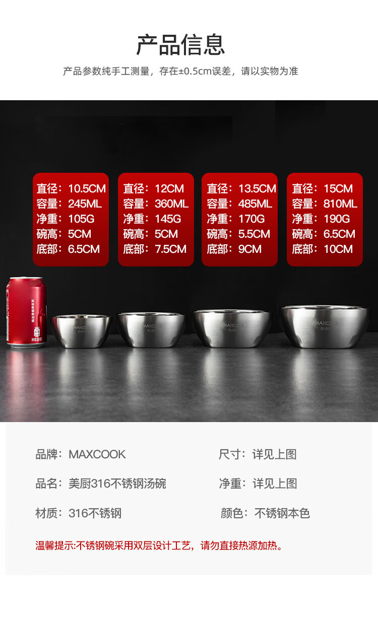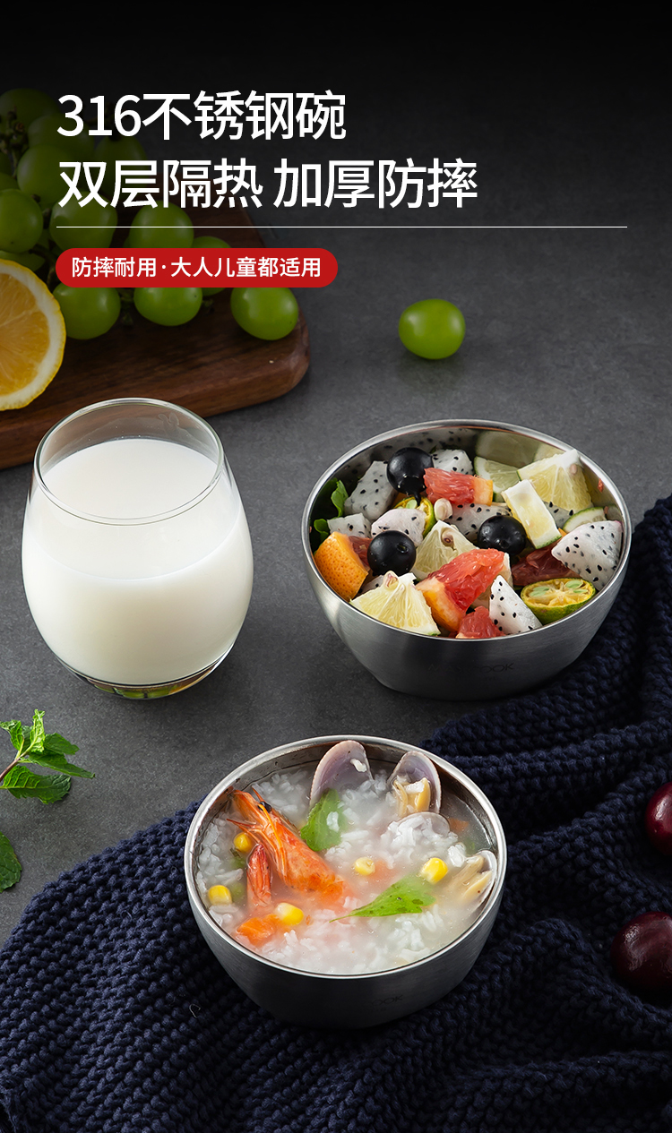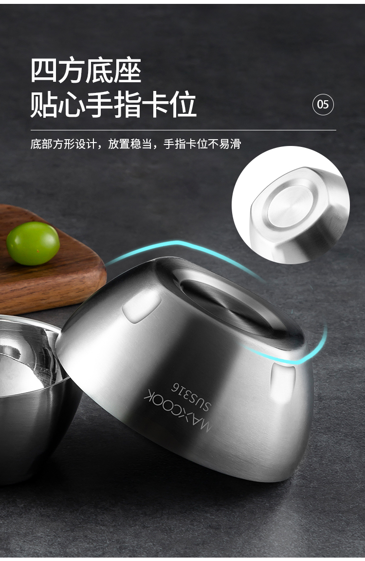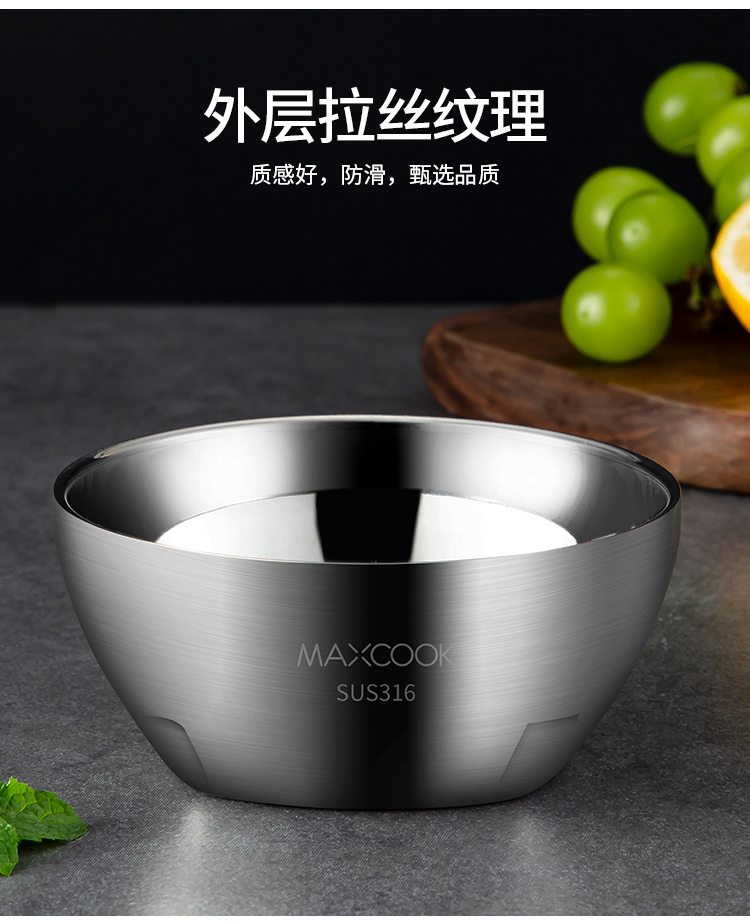 美厨316不锈钢双层隔热汤碗面碗15CM MCWA9600