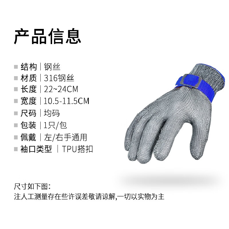 百舸 316不锈钢5级防割手套防刺防咬防切防护钢丝铁手套 一只(单位:只) 灰色