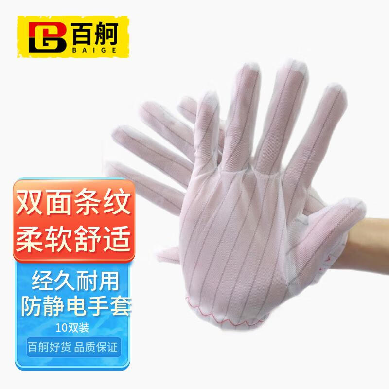 百舸 防静电手套双面条纹 防滑薄款 10双(单位:包) 白色