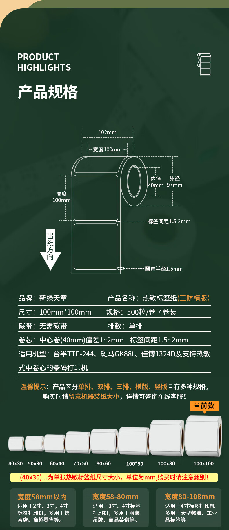 新绿天章 白格热敏三防标签 P3999 100mm*100mm 500粒/卷 4卷 白色(单位:箱)