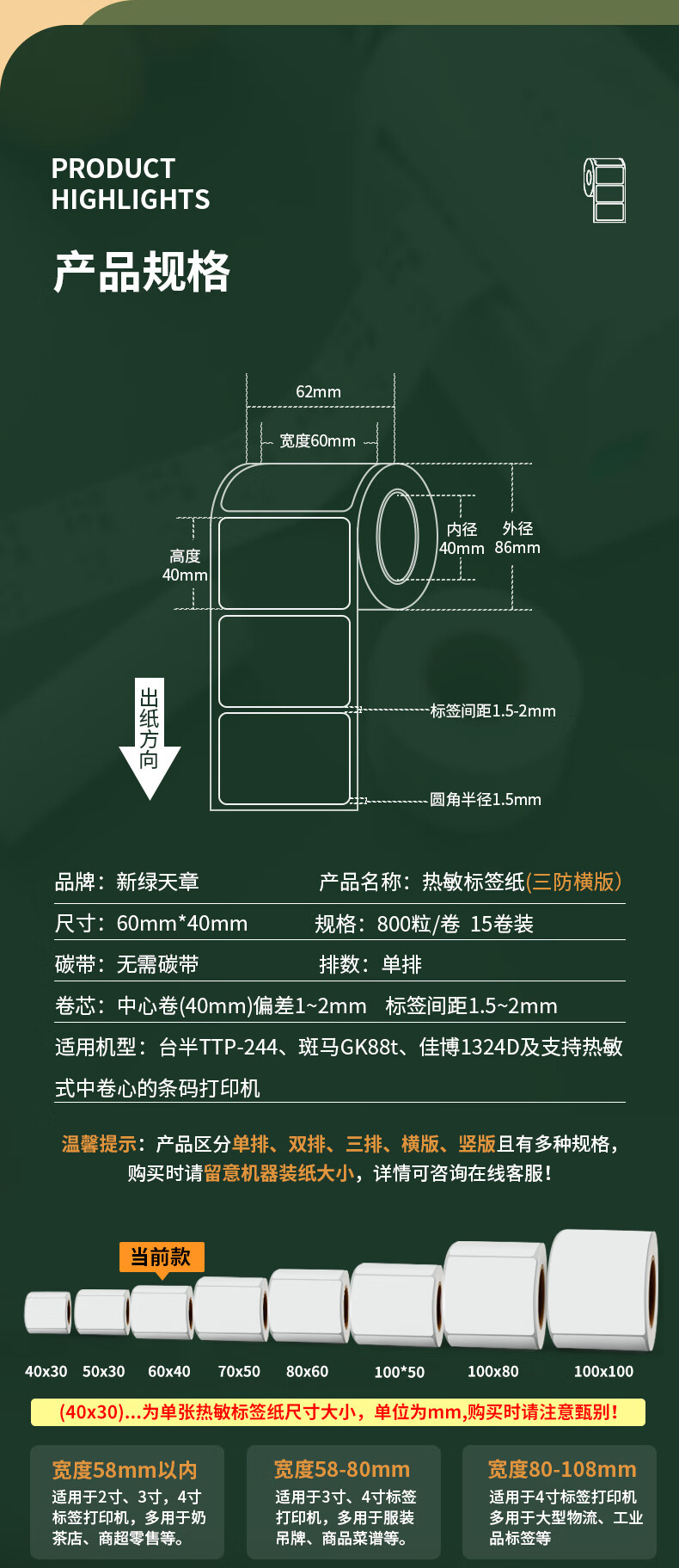 天章 (TANGO) 驿站入库 60mm*40mm 800粒/卷 15卷/箱 三防热敏标签打印纸 白色(单位:箱)