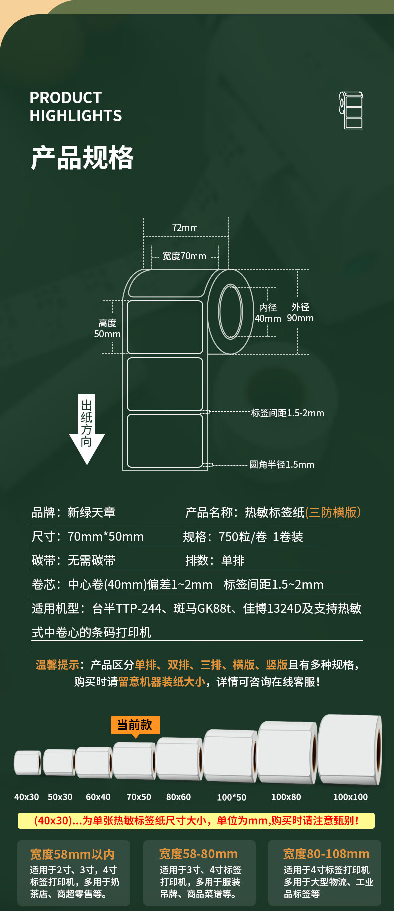 新绿天章 P3464 70x50mm 白格热敏三防标签 白色(单位:卷 )