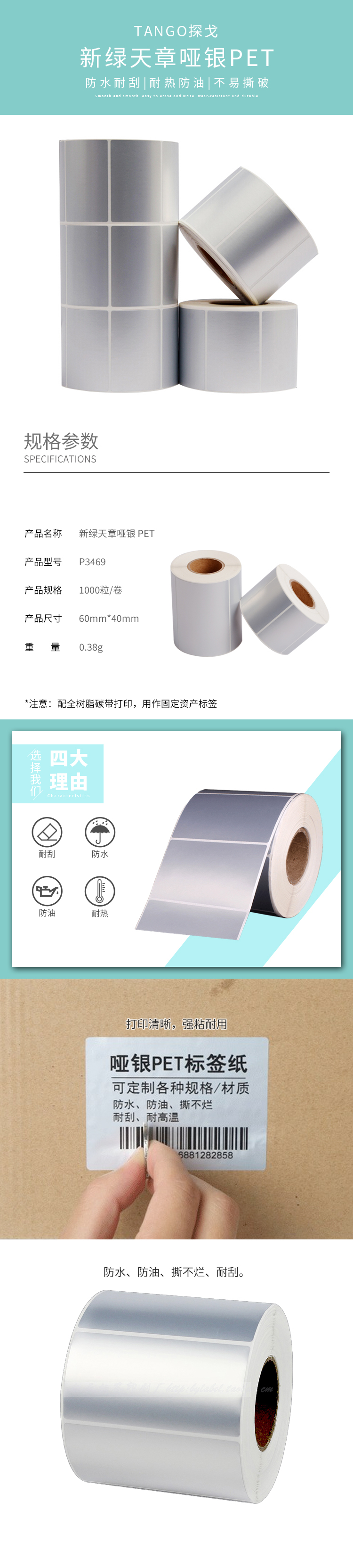 天章 (TANGO) P3468 60mm*40mm 1000枚单排 哑银PET不干胶 哑银色(单位:卷)