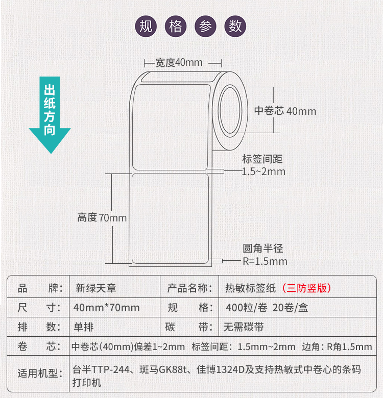 新绿天章 P3431 40mm*70mm 400张/卷 20卷 蓝格热敏三防标签纸 蓝色(单位:箱)