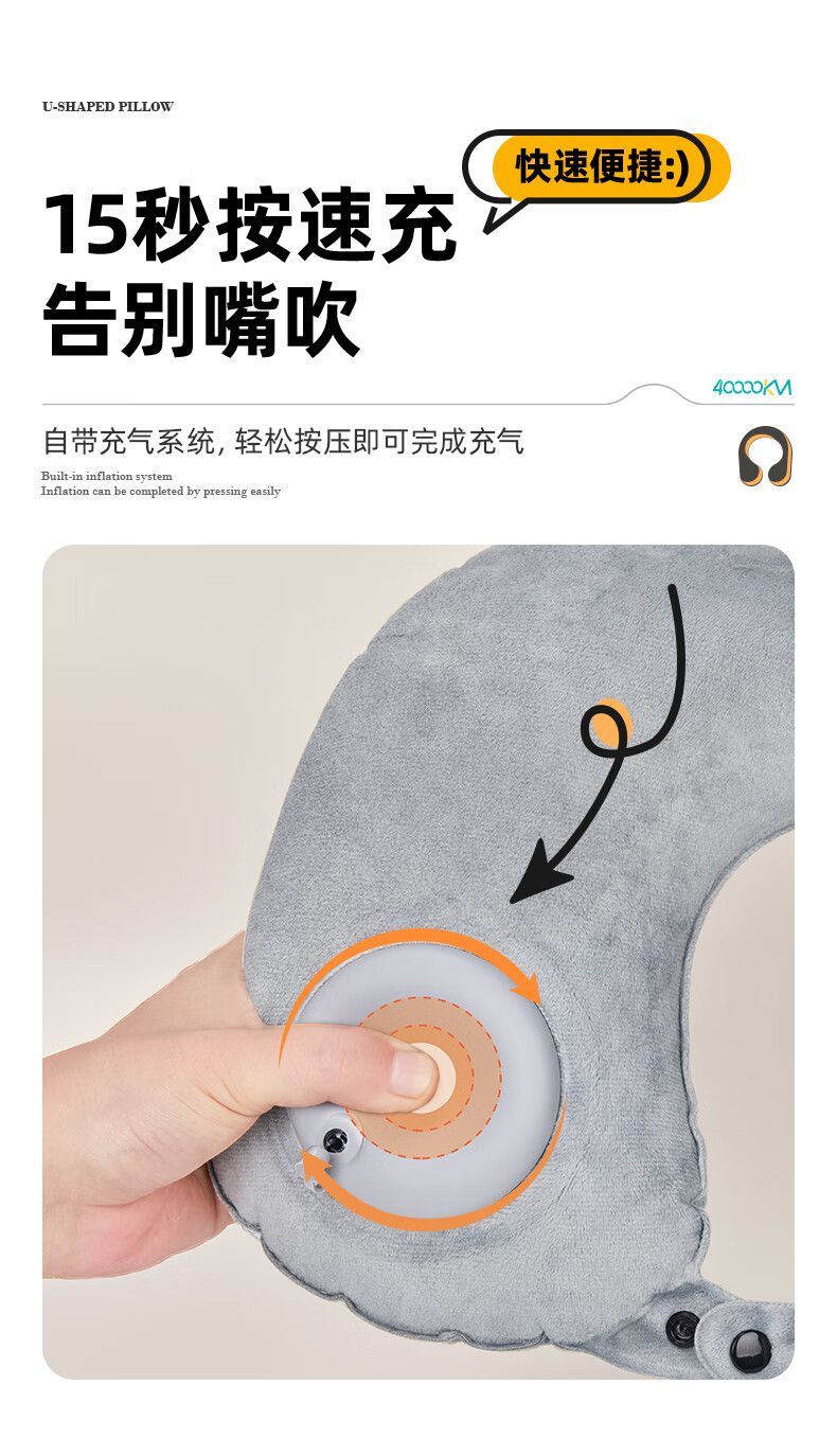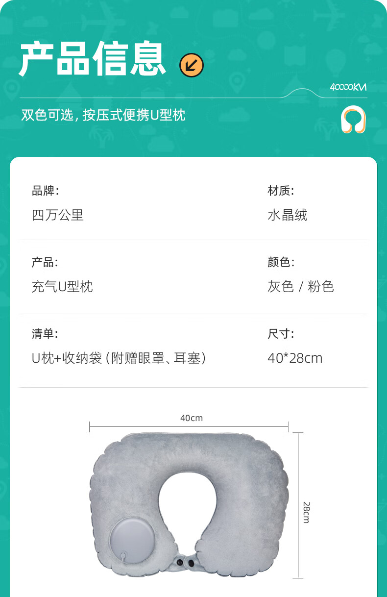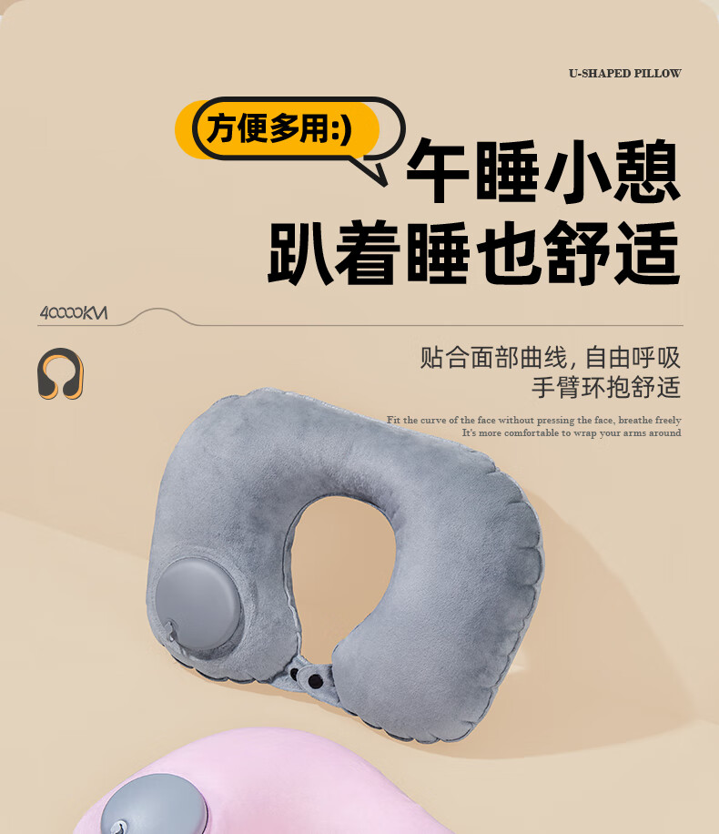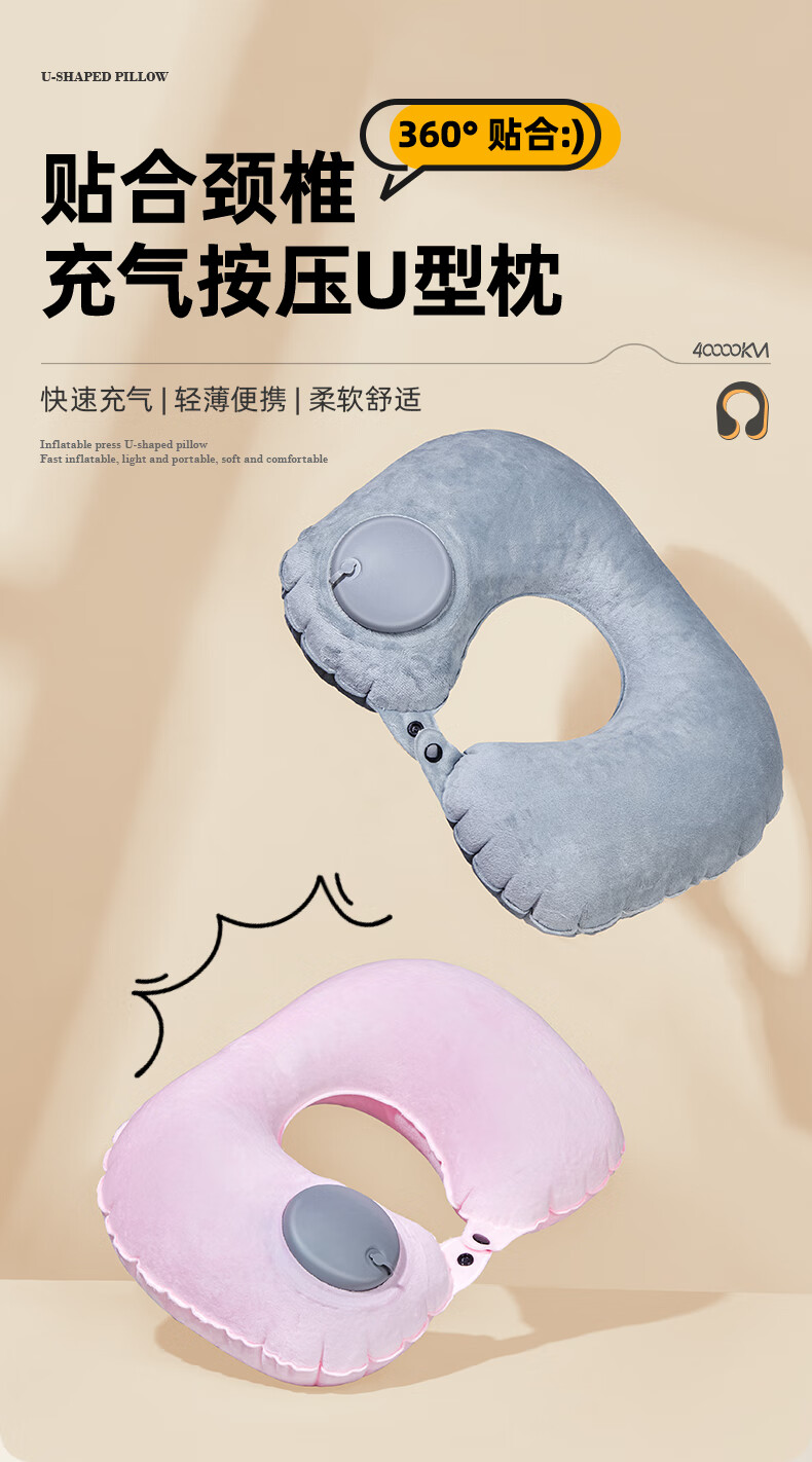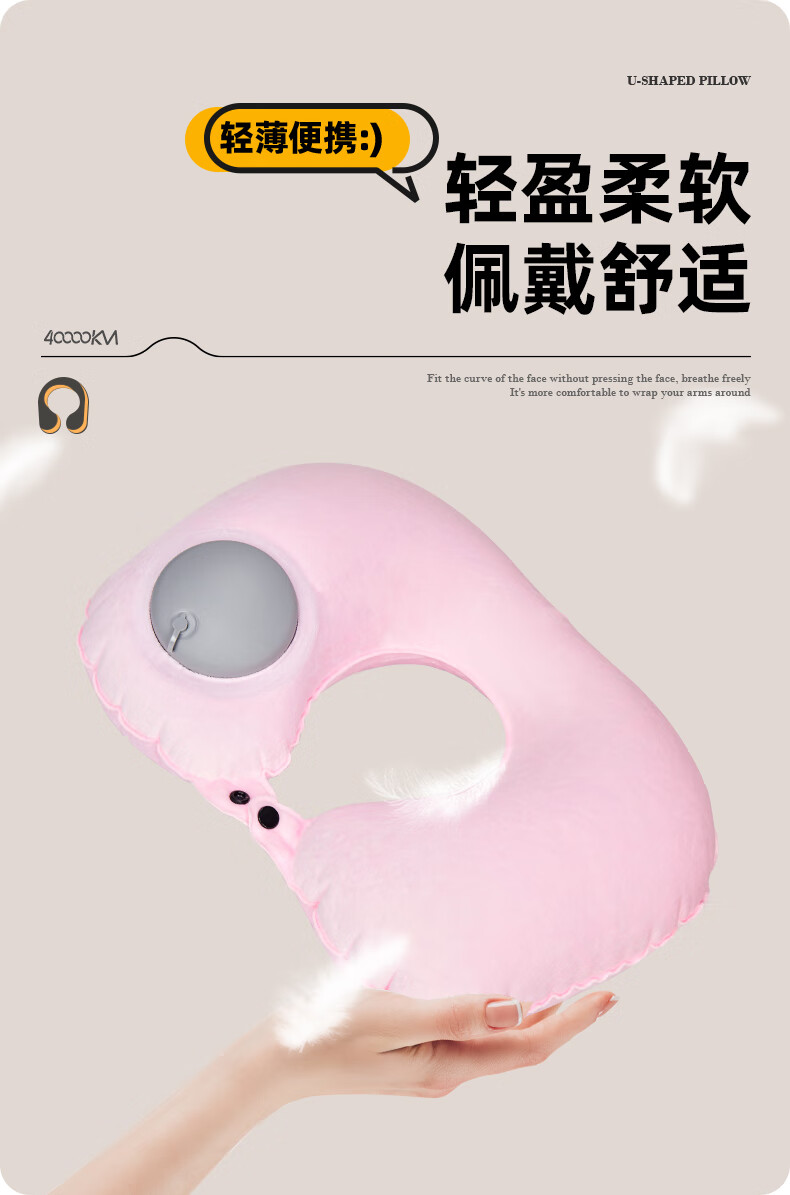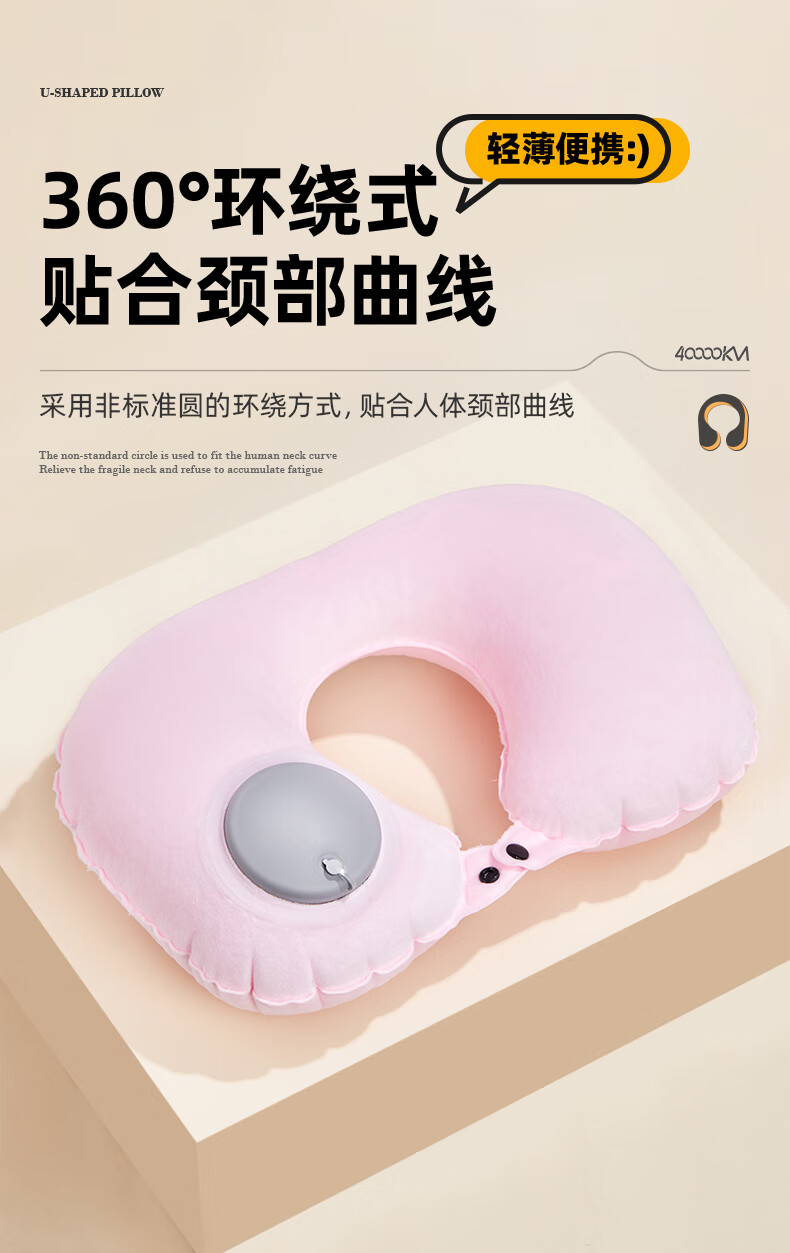 四万公里 按压充气u型枕 40*28cm 充气u型枕头 粉色(单位:个)