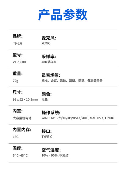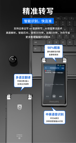 飞利浦(PHILIPS) VTR8600 16G AI智能录音笔 黑色(单位:支)