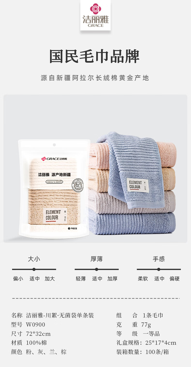 洁丽雅(Grace) 川絮面巾单条 W0900 72*32cm/77g 混色(单位:条)