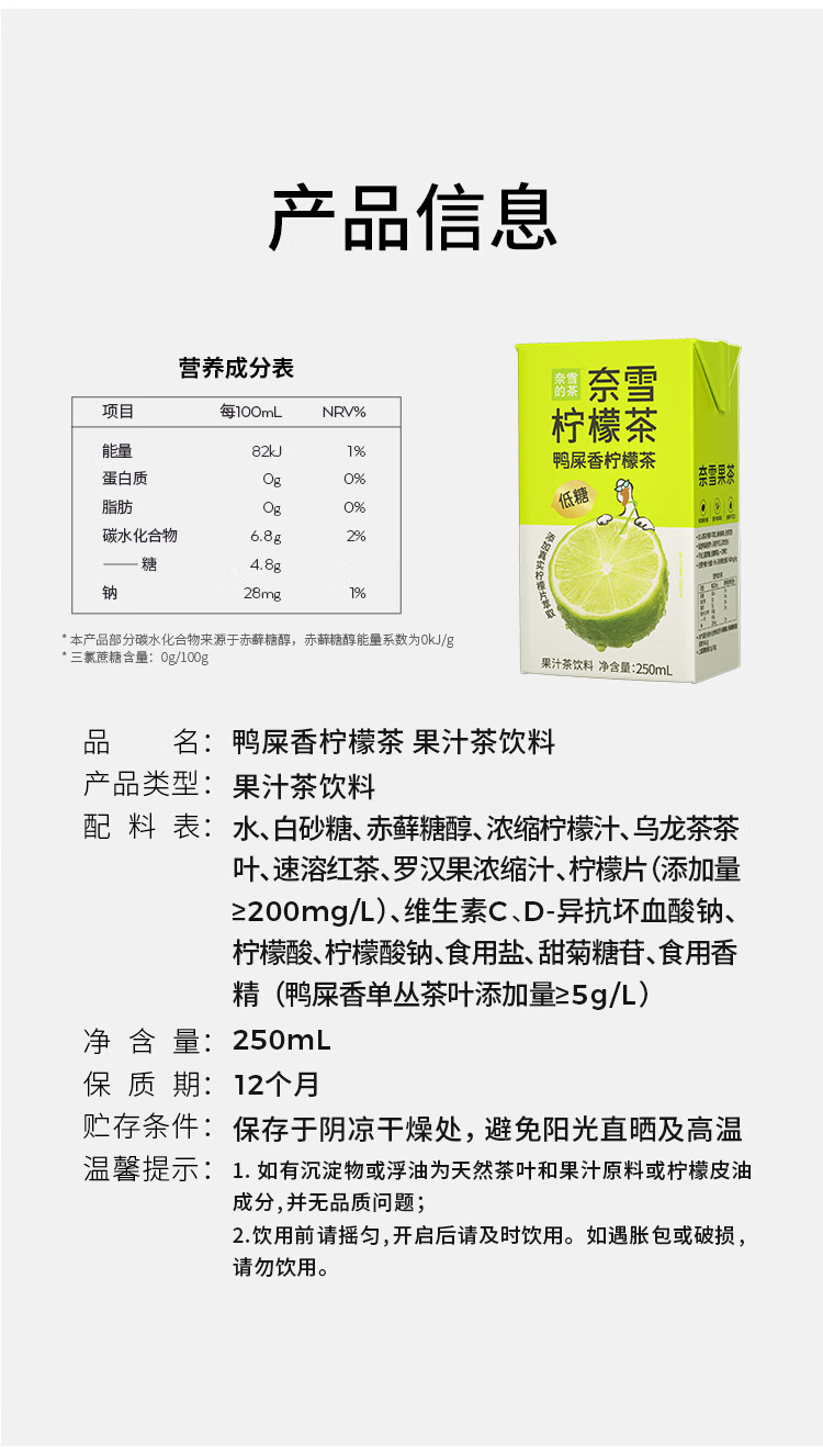 奈雪的茶 鸭屎香柠檬茶 果汁茶饮料 低糖饮品250ml*6盒*4提 柠绿色 250ml*6盒*4提