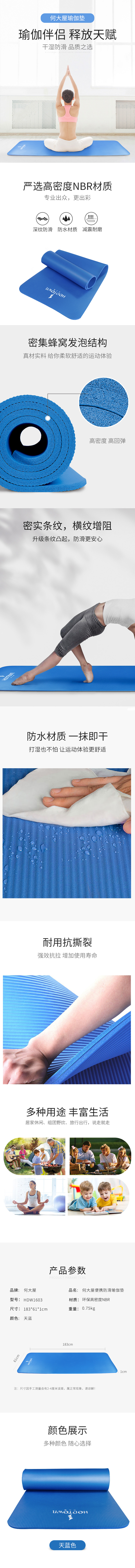 何大屋 便携防滑瑜伽垫 HDW1603 183*61*1cm (单位:个) 蓝色
