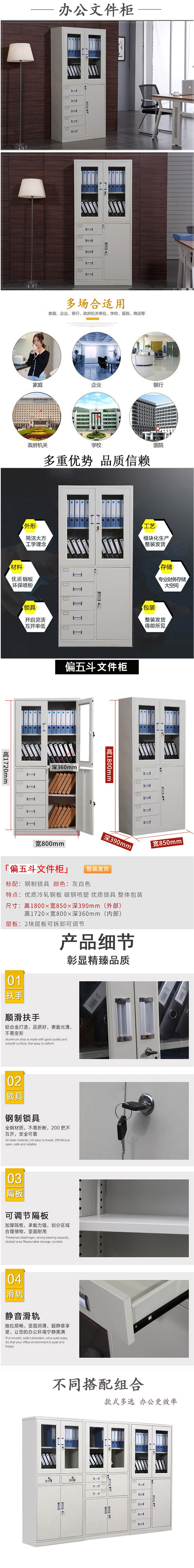 企诺 企诺 文件柜资料柜铁皮档案柜偏五斗柜 QNGa12A1-04PA 850*390*1800mm|0.4mm 灰白色(单位:个)