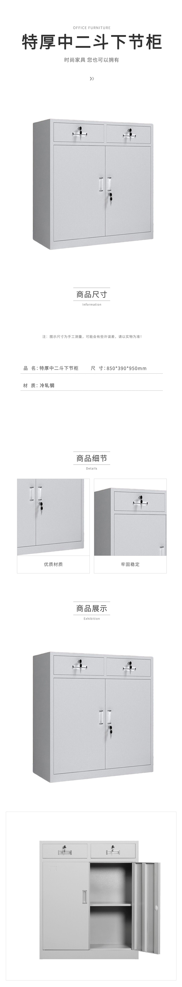 企诺 办公文件柜特厚中二斗下节柜 QNGa18A1-08PA 850*390*950mm 灰白色(单位:个)