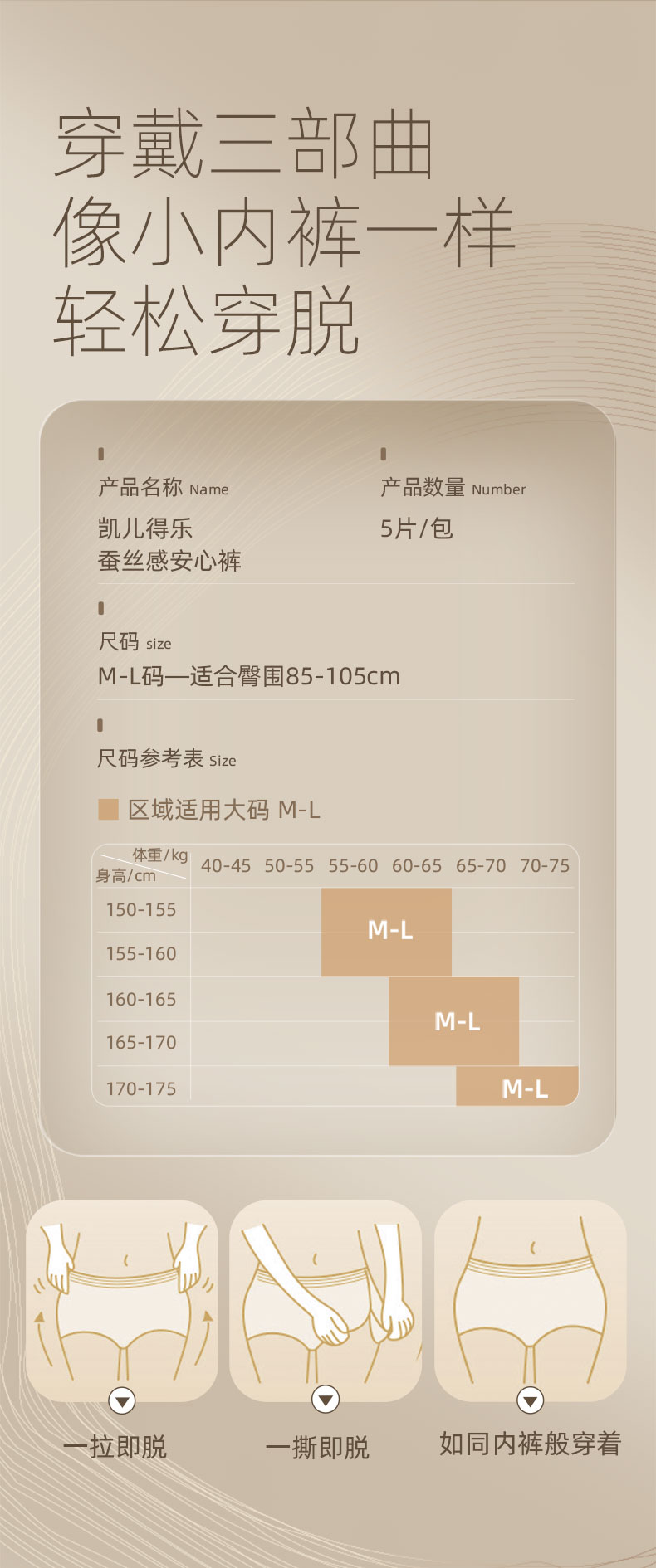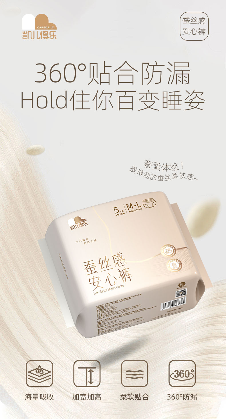 凯儿得乐(care daily) 蚕丝安睡裤(5片装)M-L 450mm超长芯体 5片/包*3包 浅咖色(单位:组)