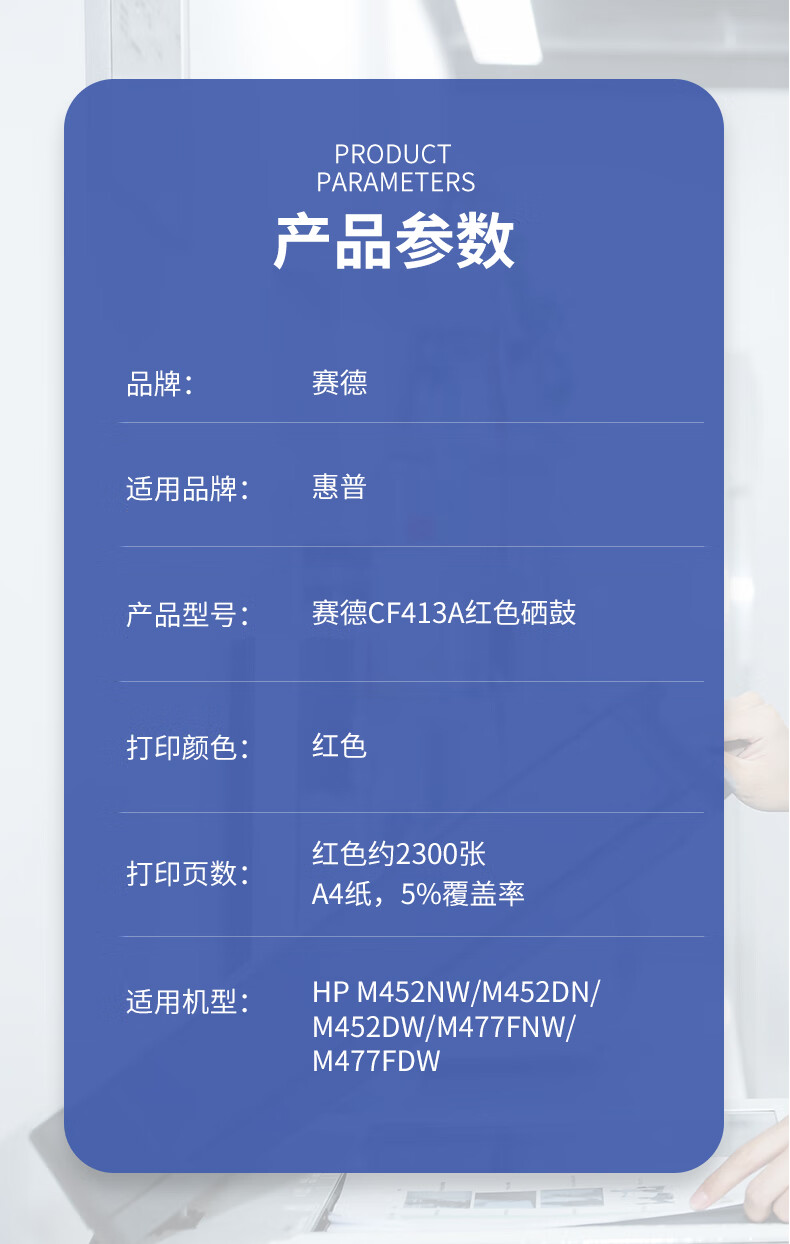 赛德 CF413A 打印量2300页 适用惠普M452NW/M452DN/M452DW/M477FNW/M477FDW 硒鼓 (计价单位:只) 红色