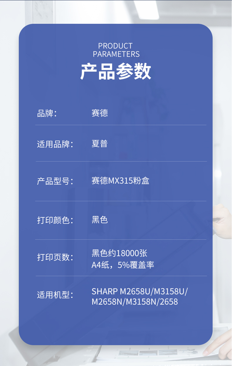 赛德 MX315 打印量18000页 适用夏普 M3158N/M2658N/M3158U/M2658U 粉盒 (计价单位:只) 黑色