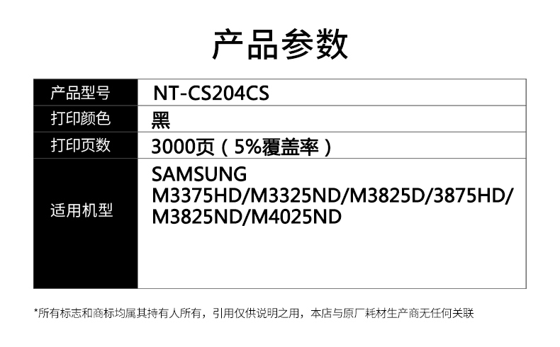 欣格 MLT-D204S NT-CS204CS 3000页 适用SAMSUNG M3375HD/M3325ND/M3825D/3875HD/M3825ND 硒鼓 (计价单位:只) 黑色