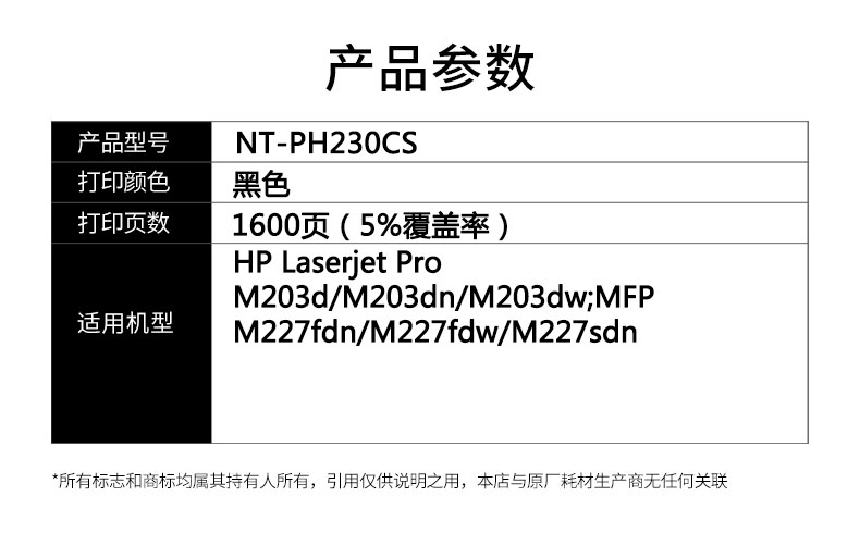 欣格 NT-PH230CS 1600页 适用惠普 203dw 227sdn 打印机 墨粉盒 1.00 只/支 (计价单位:支) 黑色