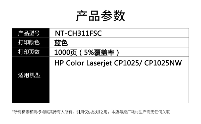 欣格 NT-CH311FSC 打印量约1000页 适用HP CP1025等 激光碳粉盒 1.00 只/支 (计价单位:支) 蓝色