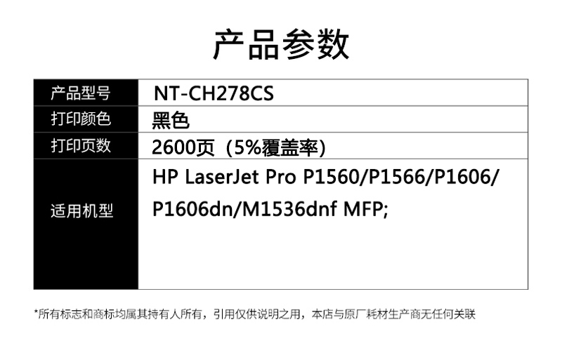 欣格 NT-CH278CS 约2600页 适用惠普 M1536MF 激光碳粉盒 1.00 只/支 (计价单位:支) 黑色