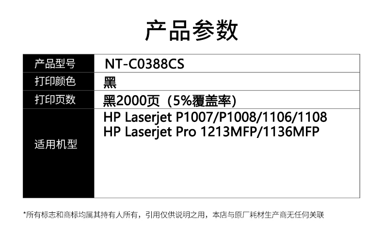 欣格 NT-C0388CS 约2000页 适用 HP 1007 1008 激光碳粉盒 1.00 只/支 (计价单位:支) 黑色