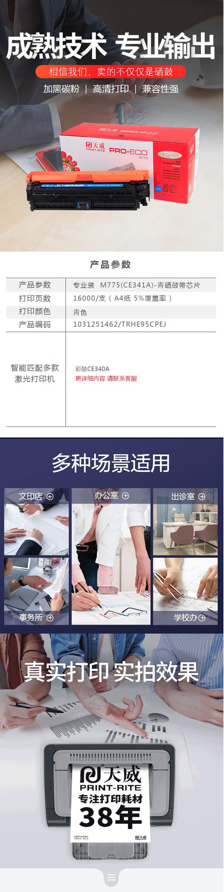 天威(PrintRite) 专业装 PR CE341AR 适用于HP M775(CE341A) 带芯片 打印量16000页 硒鼓 1.00 只/支 (计价单位:支) 青色