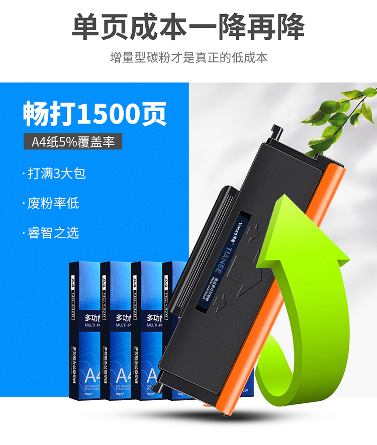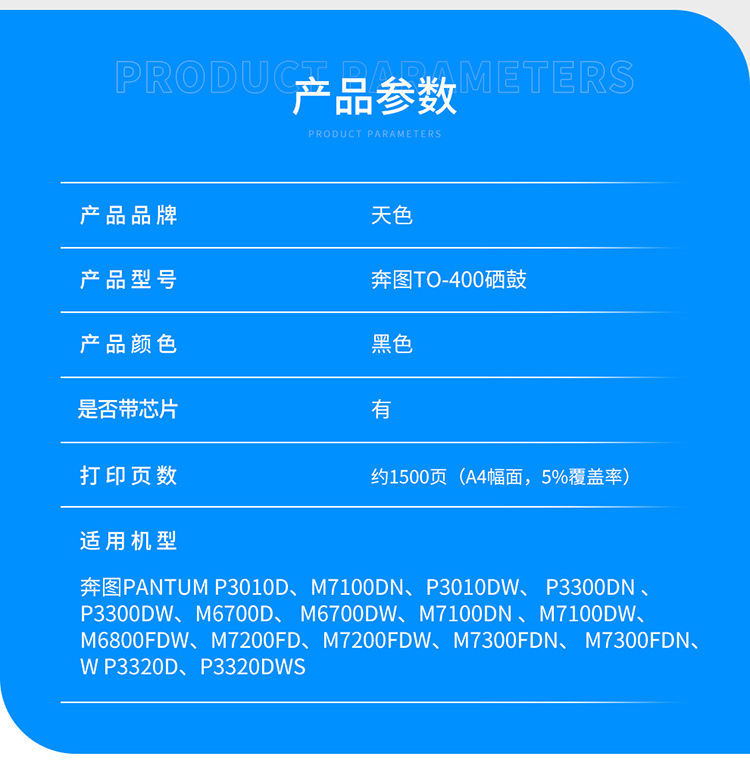 天色 TO-400 1500页 1支装 适用奔图P3010、P3300、M6700、M6800、M7100、M7200 硒鼓 1.00 只/支 (计价单位:支) 黑色