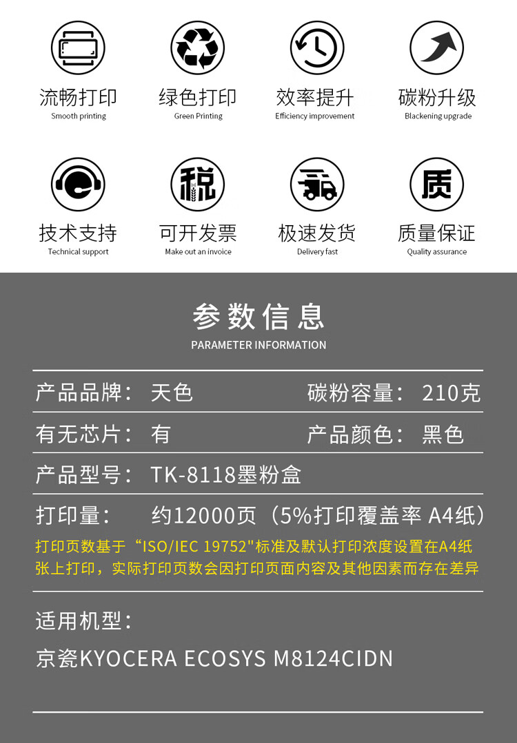 天色 TK-8118 12000页 1支装 适用京瓷Kyocera ECOSYS M8124cidn 硒鼓 1.00 只/支 (计价单位:支) 黑色