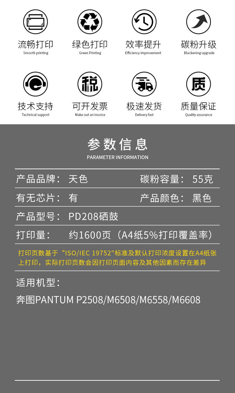 天色 PD-208 1600页 1支装 适用奔图P2508、M6508、M6558、M6608 硒鼓 1.00 只/支 (计价单位:支) 黑色