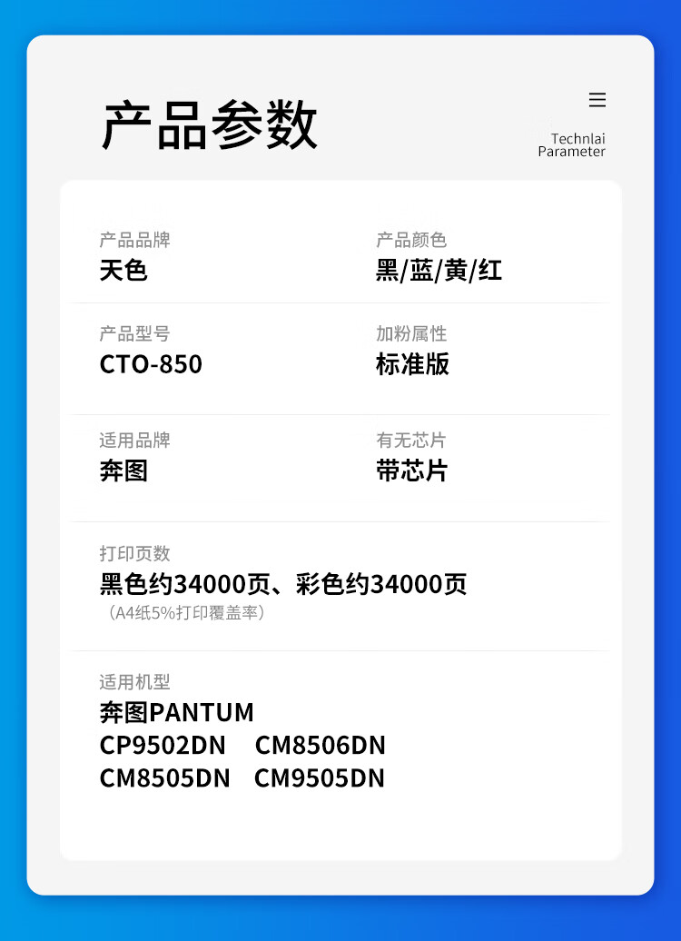 天色 CTO-850 34000页 1支装 适用奔图奔图PANTUM CP9502DN、CM8506DN、CM8505DN、CM9505DN 硒鼓 1.00 只/支 (计价单位:支) 黑色