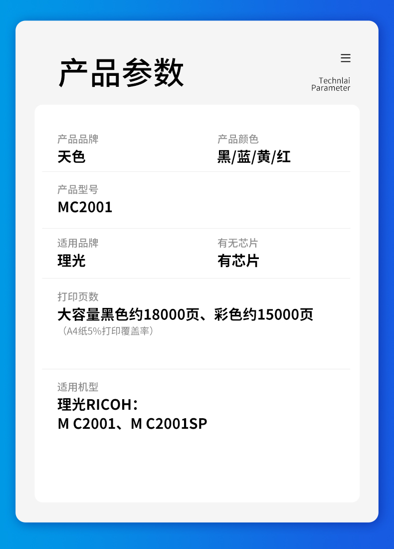 天色 M C2001 18000页 1支装 适用理光M C2000、M C2001、M C2000ew 硒鼓 1.00 只/支 (计价单位:支) 黑色