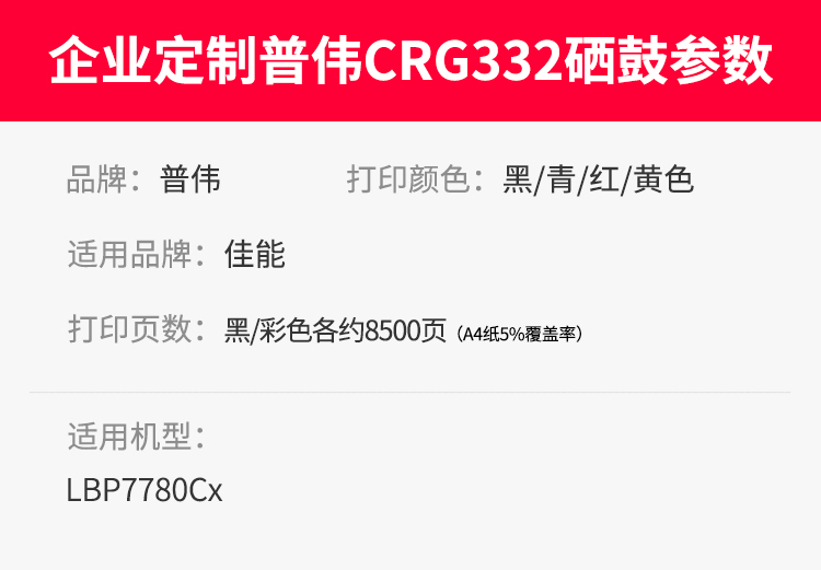 普伟 CRG-332 BK(支)(黑色5000页)适用于LBP7780Cx 硒鼓 1.00 只/支 (计价单位:支) 黑色