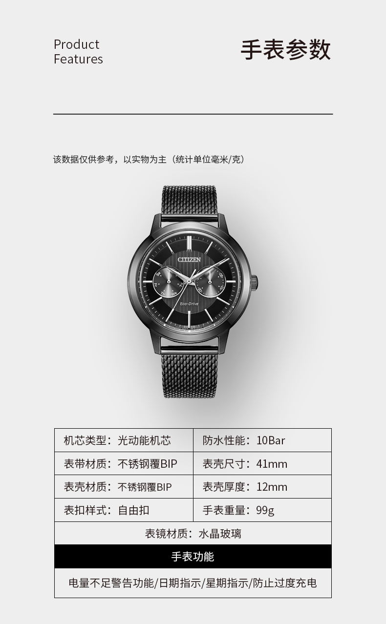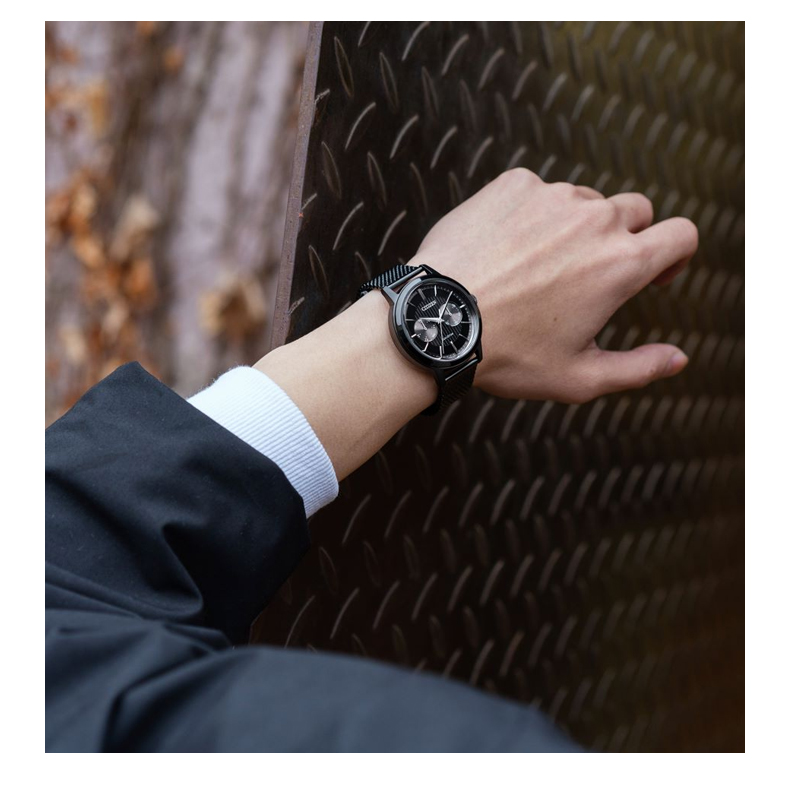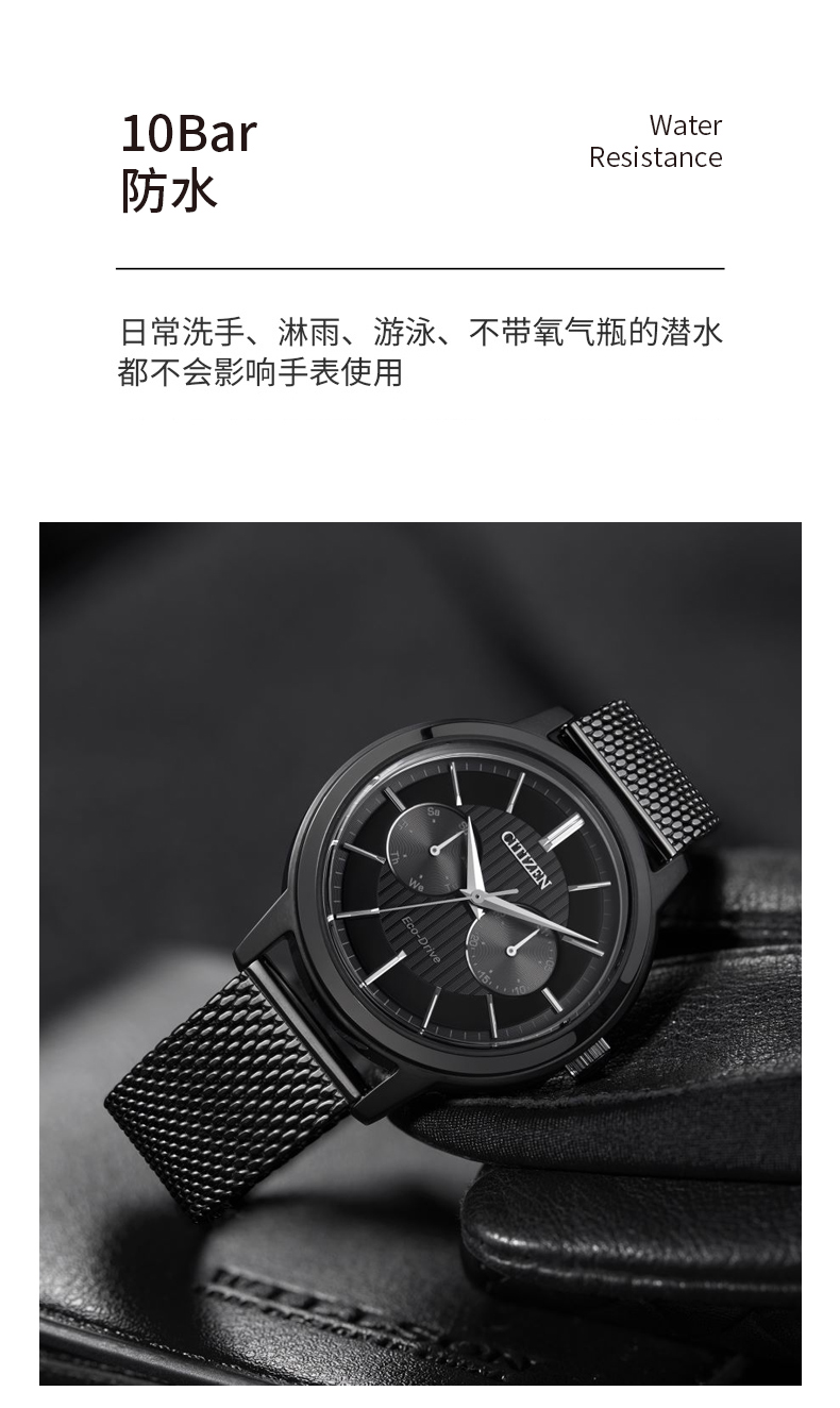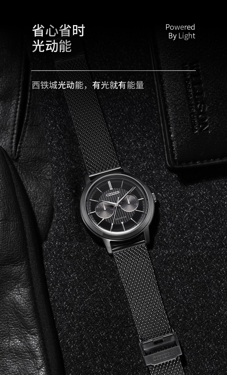 Citizen西铁城 光动能手表日星双显时尚商务黑盘不锈钢覆BIP表带男表BU4034-82E 黑色